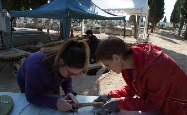 El equipo de Memoria Histórica desenterraba, a las 11:18 horas de ayer, un cráneo y un fémur de la capa más profunda de la cuarta fosa del cementerio del Carmen. «Es una mujer; sin duda una mujer», concluye la bióloga del grupo. Y los datos quedan registrados. Se trata de la segunda mujer hallada en esta fosa, la más grande del camposanto vallisoletano, un espacio de 3,30 metros de largo por tres metros de ancho y 2,15 metros de profundidad en el que se han hallado 42 cuerpos de represaliados en la Guerra Civil. Estaban enterrados en cinco niveles y entre cada uno de ellos había capas de tierra y cal de hasta treinta centímetros. Los cuerpos, perfectamente colocados (para aprovechar mejor el espacio) y muchos, metidos en ataúdes de pino. La exhumación acabará la próxima semana. Empezará luego el estudio de los restos.