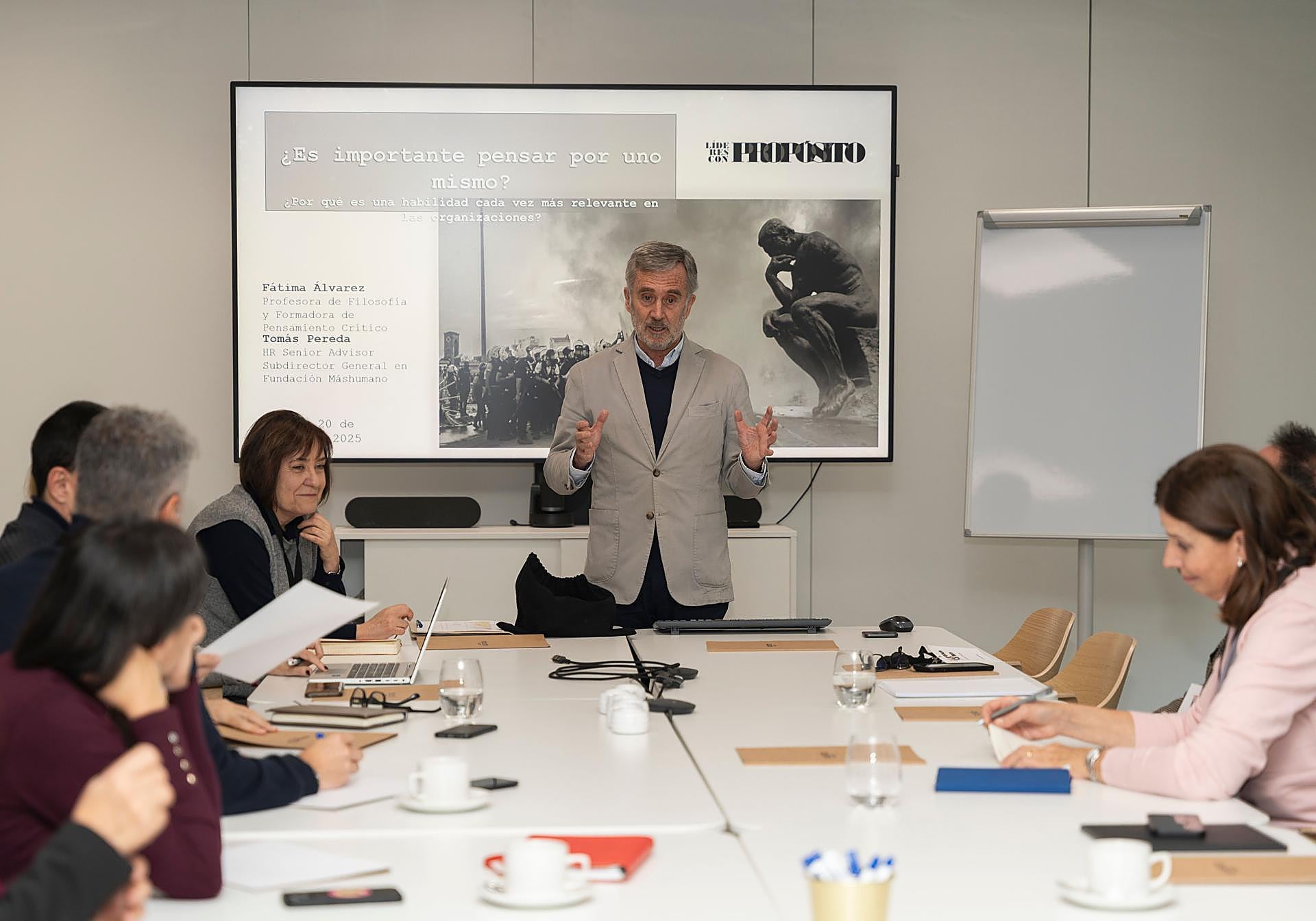 En este escenario, el pensamiento crítico se convierte en esencial, como detallaron durante sus participativas exposiciones Tomás Pereda, subdirector general de la fundación Máshumano, consultor senior de recursos humanos y miembro del comité asesor de Líderes con Propósito, y la filósofa Fátima Álvarez, autora, entre otras publicaciones, del libro 'Tomarse la empresa con filosofía', y formadora de estudiantes universitarios, profesorado y empresas. Ambos compartieron sus conocimientos en una activa sesión organizada por la comunidad Líderes con Propósito, de Vocento, con representantes de empresas como Deloitte, ISS, L'Oreál Groupe, Santander, Ecoembes, CEU San Pablo, Picnic y Tendam.