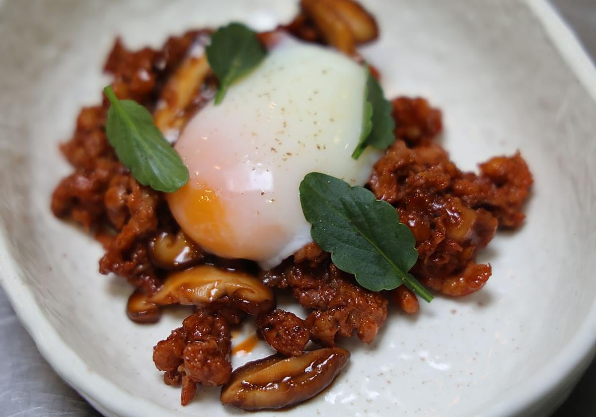 Jijas con setas shiitake, huevo a baja temperatura y Pedro Ximénez por el chef Raúl del Moral