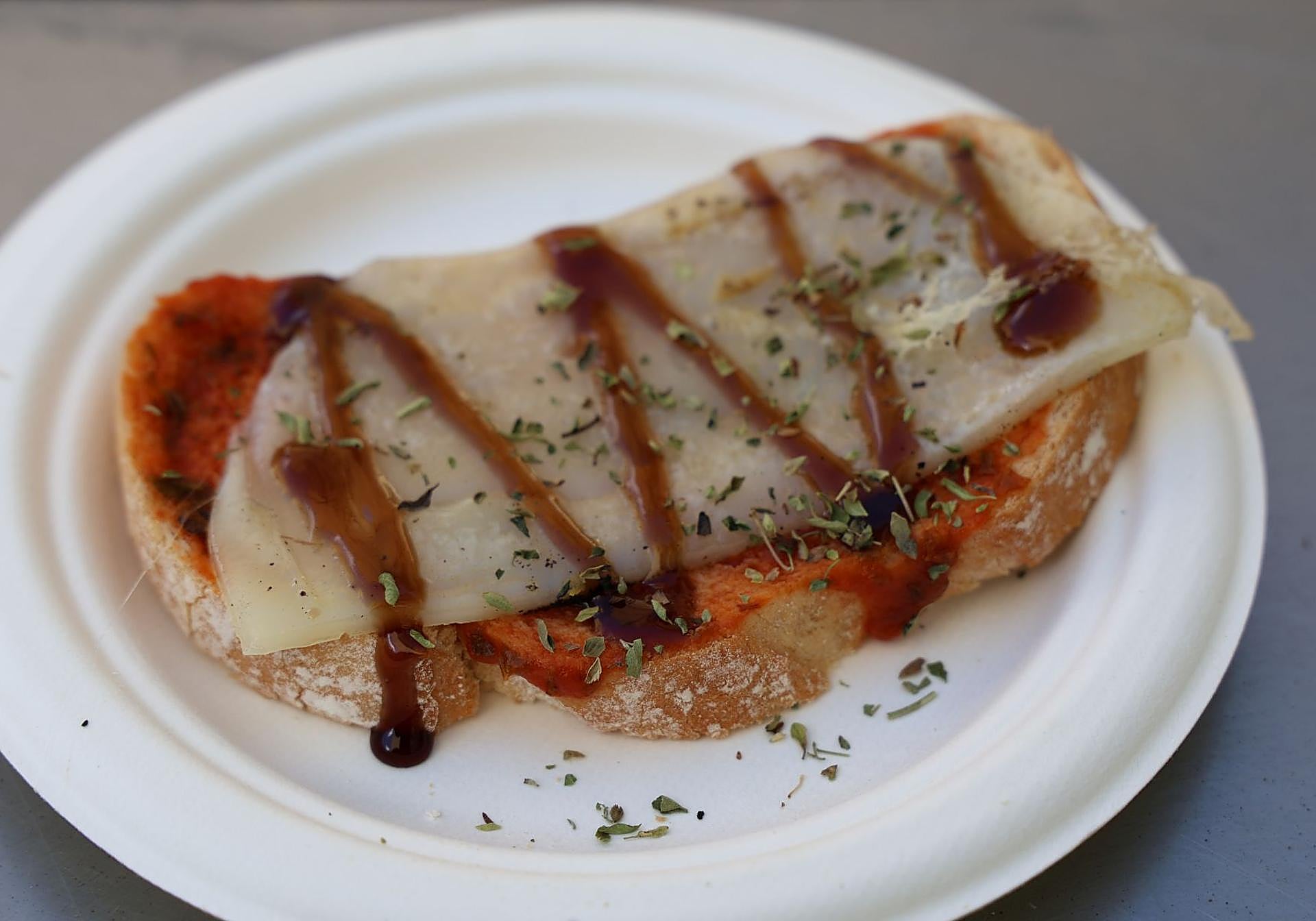 Acompañada de una salsa de frutos rojos que aporta un toque dulce para aligerar su sabor, la tosta de provolone a la plancha es una elección válida para los amantes del queso. Se sirve sobre pan tostado con tomate e incluye como 'topping' hierbas provenzales.