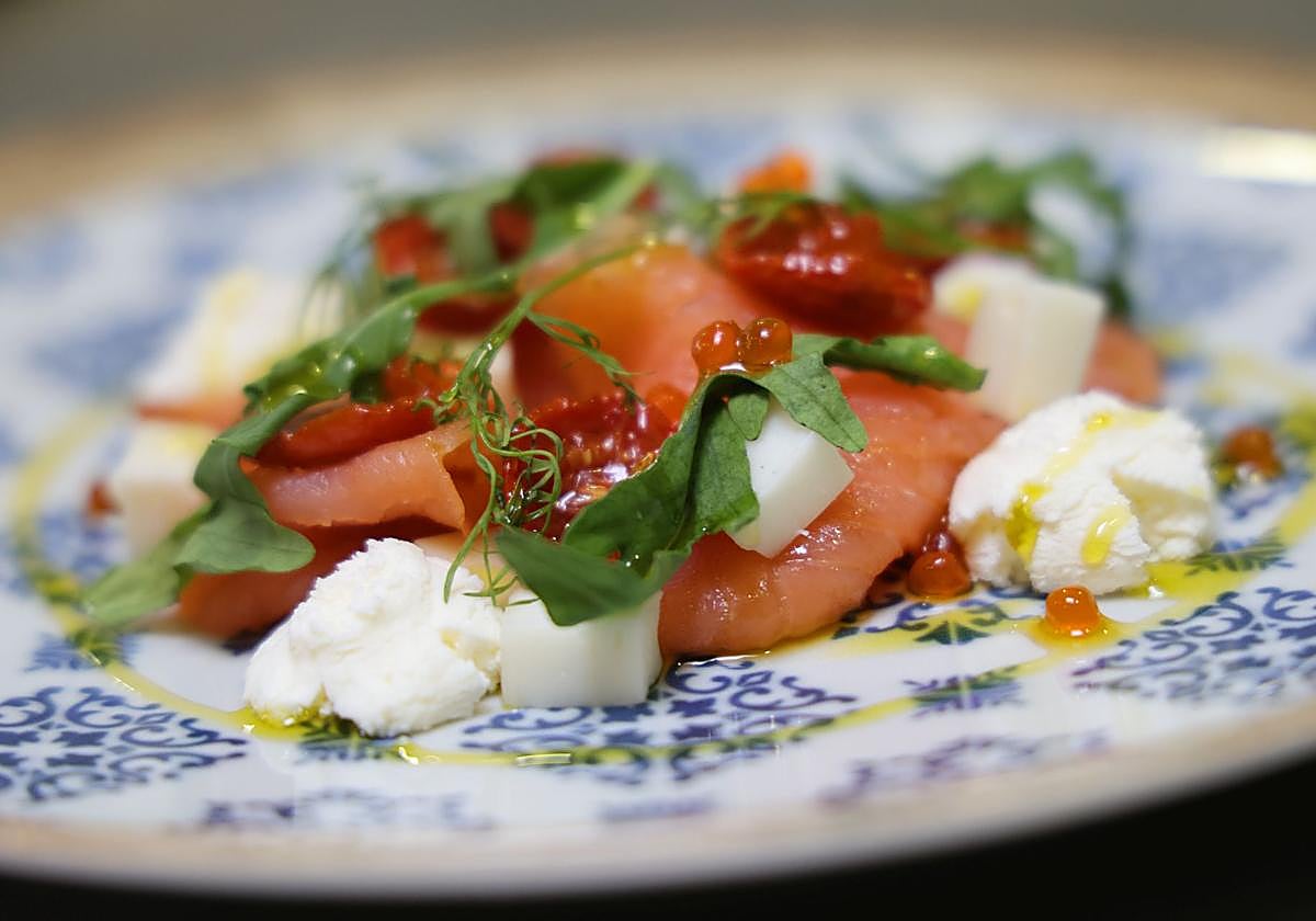 Se trata de una propuesta ligera y refrescante, ideal como entrante o cena. La clave está en el equilibrio entre texturas y sabores. El ahumado del pescado, la cremosidad de los quesos, el dulzor concentrado del tomate y el punto original de la rúcula y el eneldo.