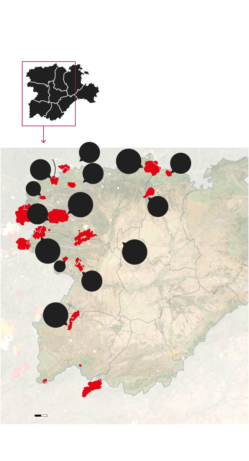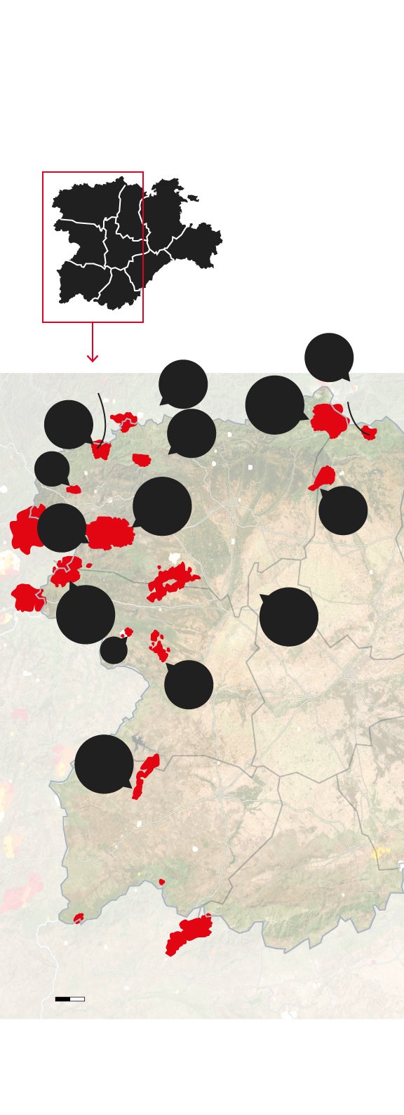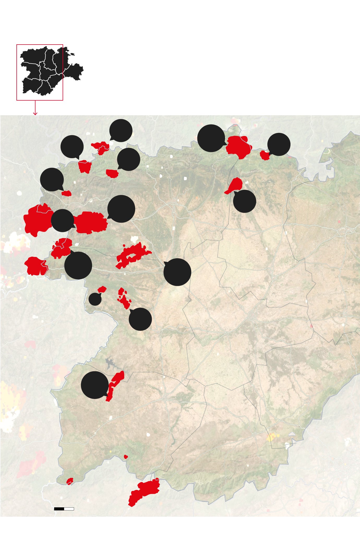 Las imágenes por satélite del Sistema Europeo de Información sobre Incendios Forestales (EFFIS) permiten obtener una primera aproximación a la magnitud del desastre. Sus cálculos hablan, solo si se computan los grandes incendios, de 162.565 hectáreas devoradas por el fuego. Es una barbaridad. Supone el 1,7% del total de la extensión de Castilla y León. Es como si se hubieran si hubiera ardido la superficie ocupada por 41 ciudades como León.