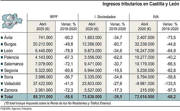 Las cifras que maneja la Agencia Tributaria revelan que durante abril, la recaudación en Castilla y León se situó en los 239,4 millones de euros, lo que supone un descenso del 58,3 por ciento respecto al mismo mes del año anterior, es decir, 334,66 millones menos. Sobre mojado llueve, ya que la recaudación en la comunidad ya entró en negativo el pasado mes de marzo, cuando se recaudaron en Castilla y León, 99,75 millones de euros, lo que supone un descenso del 2,7 por ciento, respecto al mismo periodo de 2019.