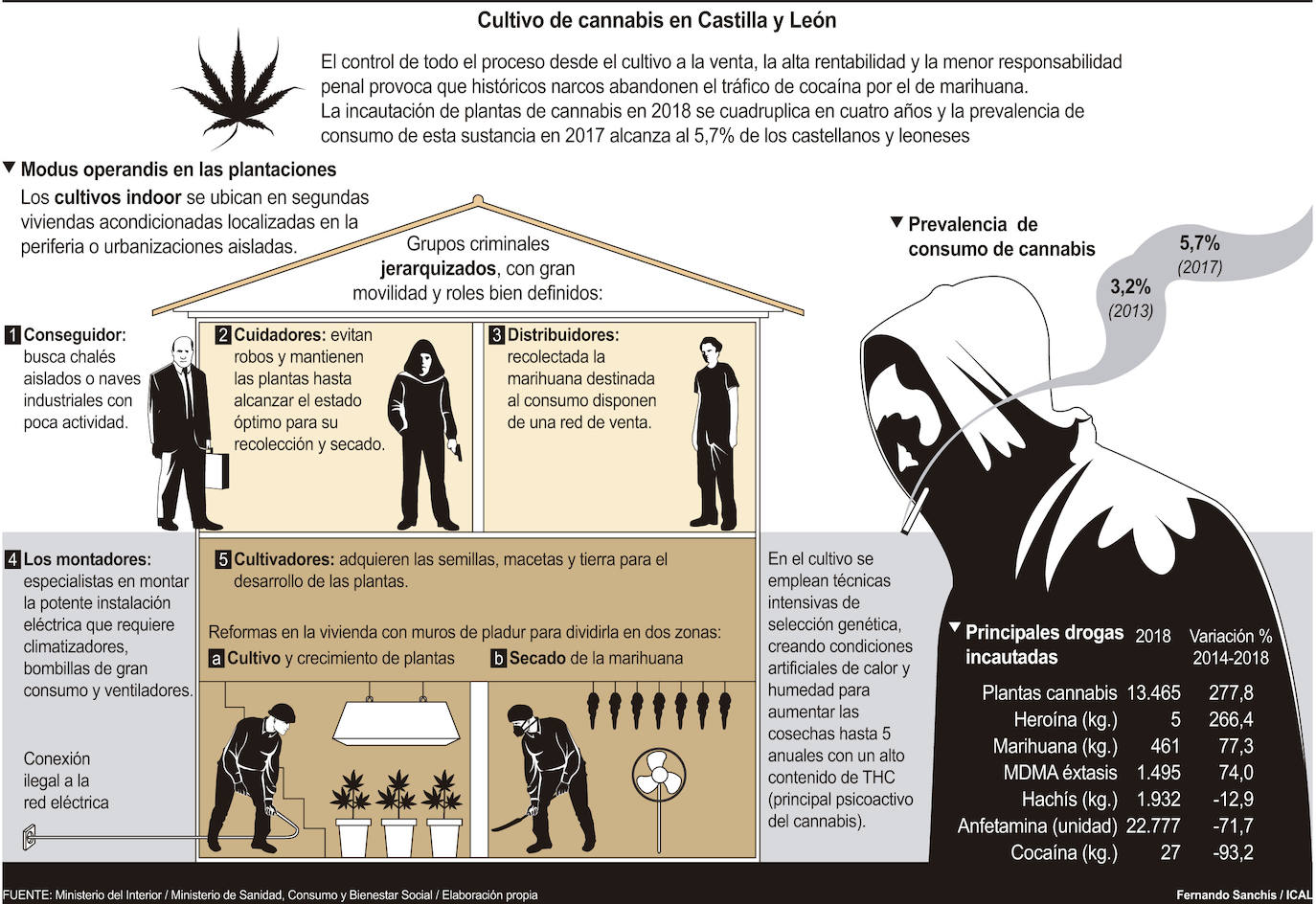 La prolifieración de este tipo de plantaciones tiene su reflejo en el número de plantas de marihuana incautadas por los Cuerpos y Fuerzas de Seguridad del Estado, que en Castilla y León se ha multiplicado por cuatro desde el año 2014, al pasar de las 3.564 a las 13.465 decomisadas el pasado año. Es un incremento superior a la media nacional, donde la cantidad de plantas se ha triplicado en este periodo y en 2018 se rozaron las 800.000.