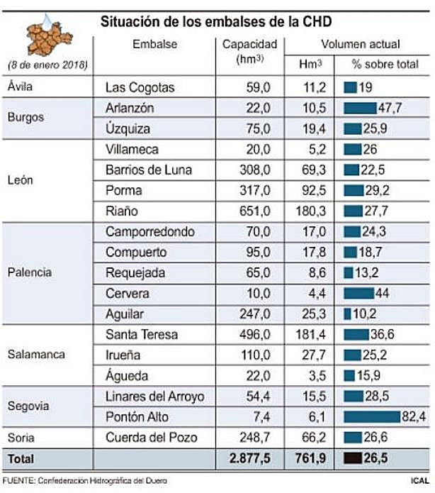 El embalse de Santa Teresa, en Salamanca, se encuentra al 36,6% de su capacidad, con 181,45 hectómetros cúbicos, cifra inferior a los 308,4 de 2017 por las mismas fechas. Por lo que respecta al sistema Águeda, el embalse de Irueña mermó en 0,2 hectómetros cúbicos la última semana y está al 25,2 por ciento, con 27,7 hectómetros cúbicos, frente a los 37,5 de 2017 por las mismas fechas. Asimismo, el del Águeda recibió 3,6 hectómetros cúbicos los últimos días, y está al 15,9% de su capacidad, con 3,5 hectómetros cúbicos, cuando un año antes almacenaba 15,6.