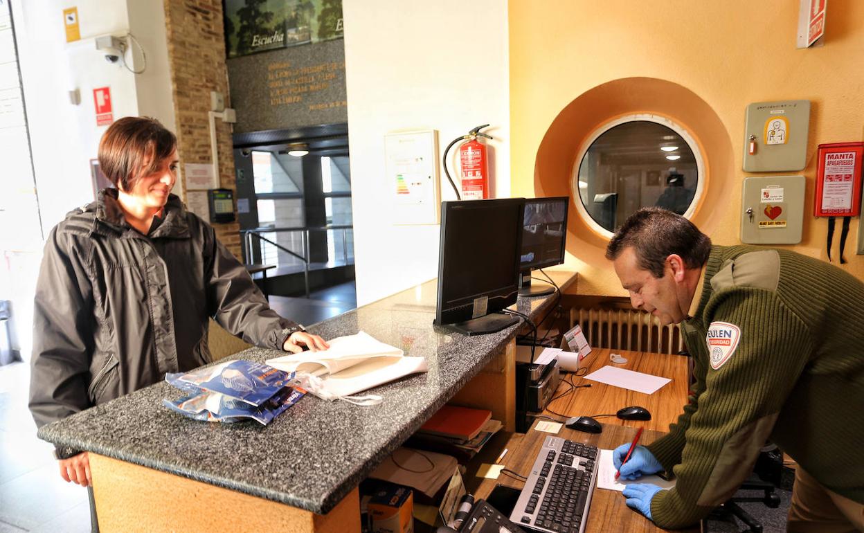 Una mujer entrega unas mascarillas en la Delegación de la Junta en Palencia Manuel Brágimo
