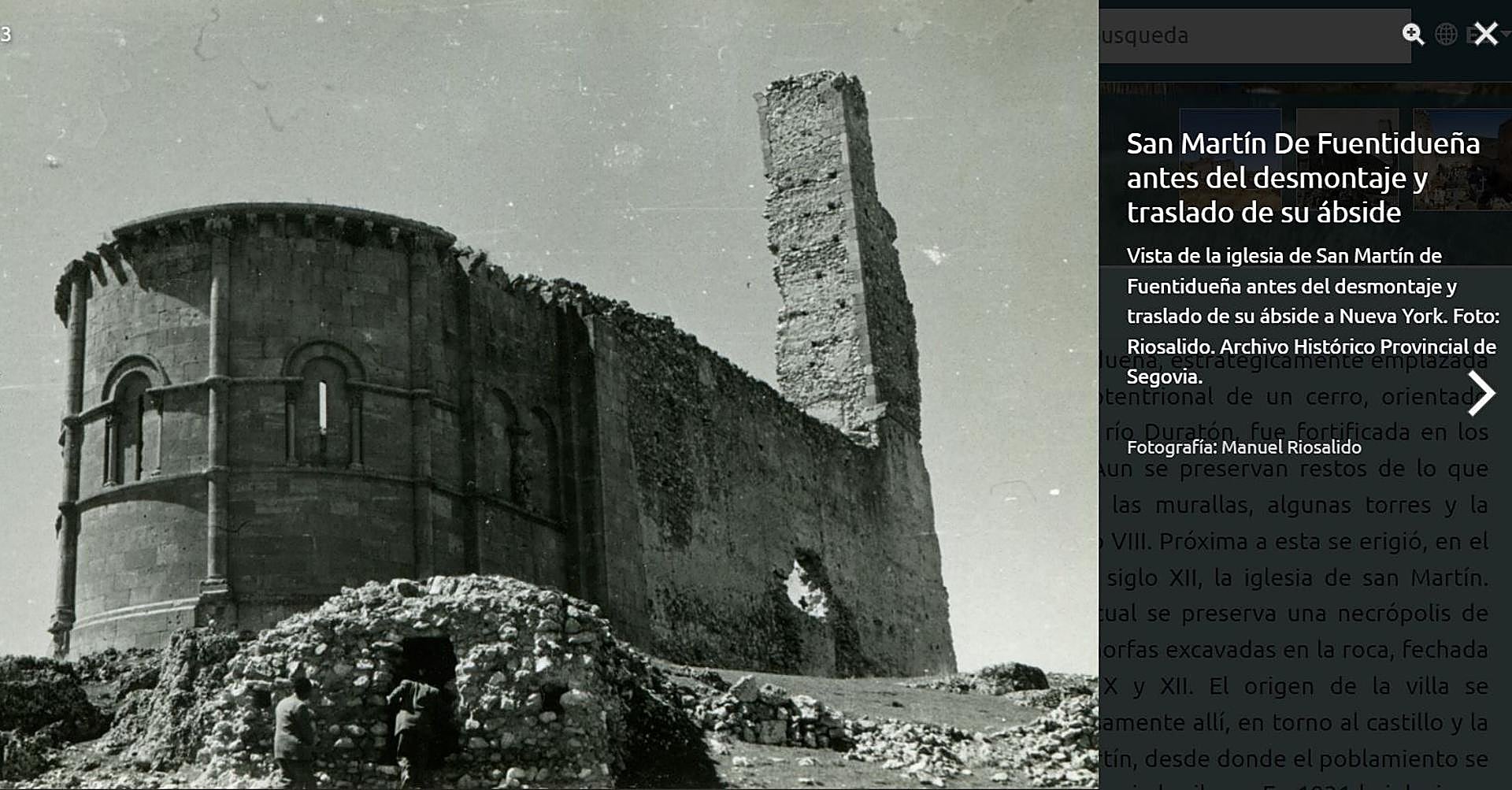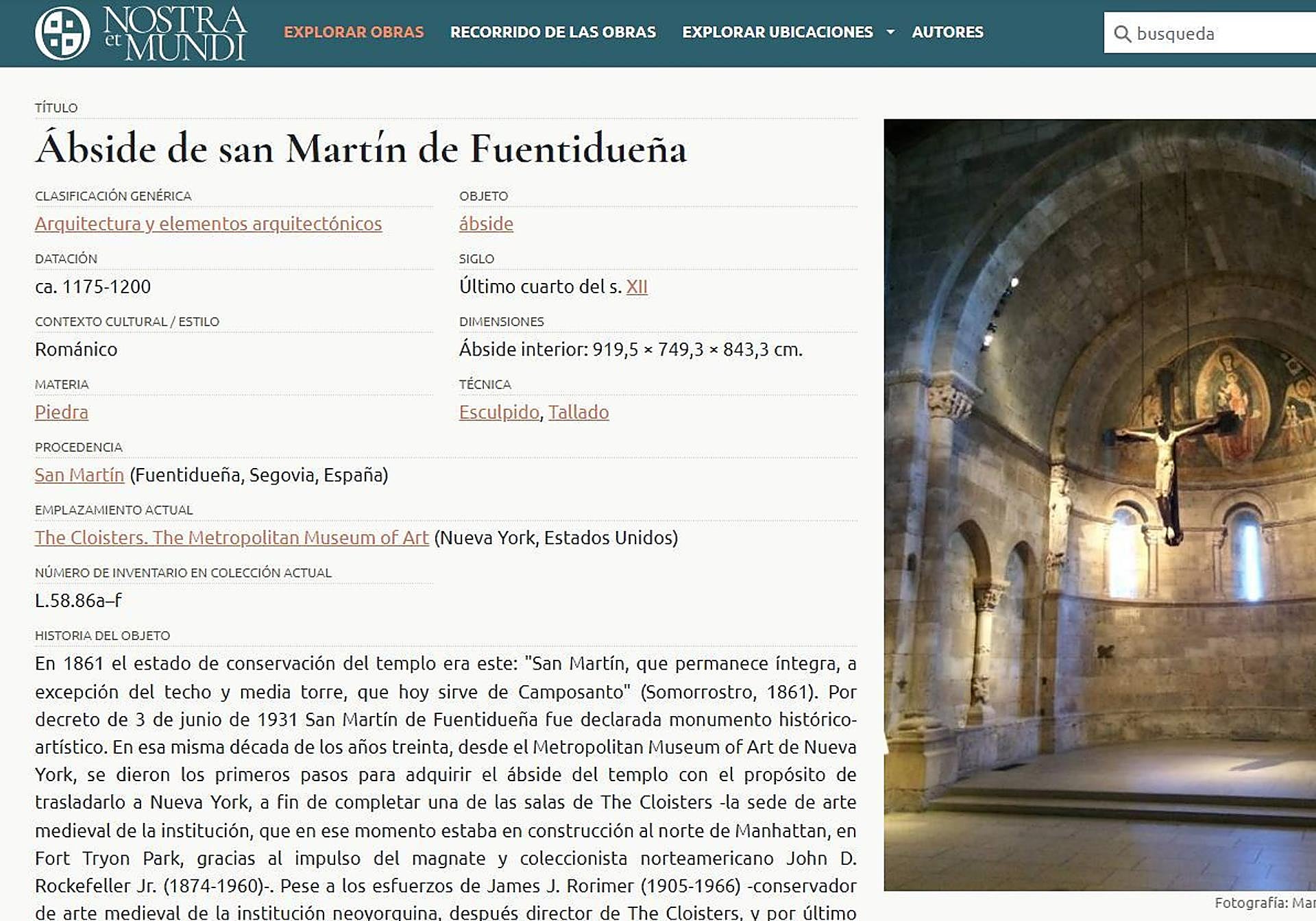 Lo más llamativo de la herramienta digital, de este catálogo virtual, es su versatilidad. «Si pinchamos en el ábside de San Martín de Fuentidueña, que hoy cierra una de las salas del Metropolitan Museum of Art de Nueva York, trazamos una historia del objeto. Hay obras que describen las piezas, pero queríamos reconstruir el periplo. Cómo llegó todo esto hasta aquí. En este caso, en 1957 el Gobierno acordó un intercambio con el museo neoyorquino», ejemplifica Martínez Ruiz. Y al mismo tiempo se puede comprobar cómo estaba la iglesia con su ábside y como está hoy sin él.