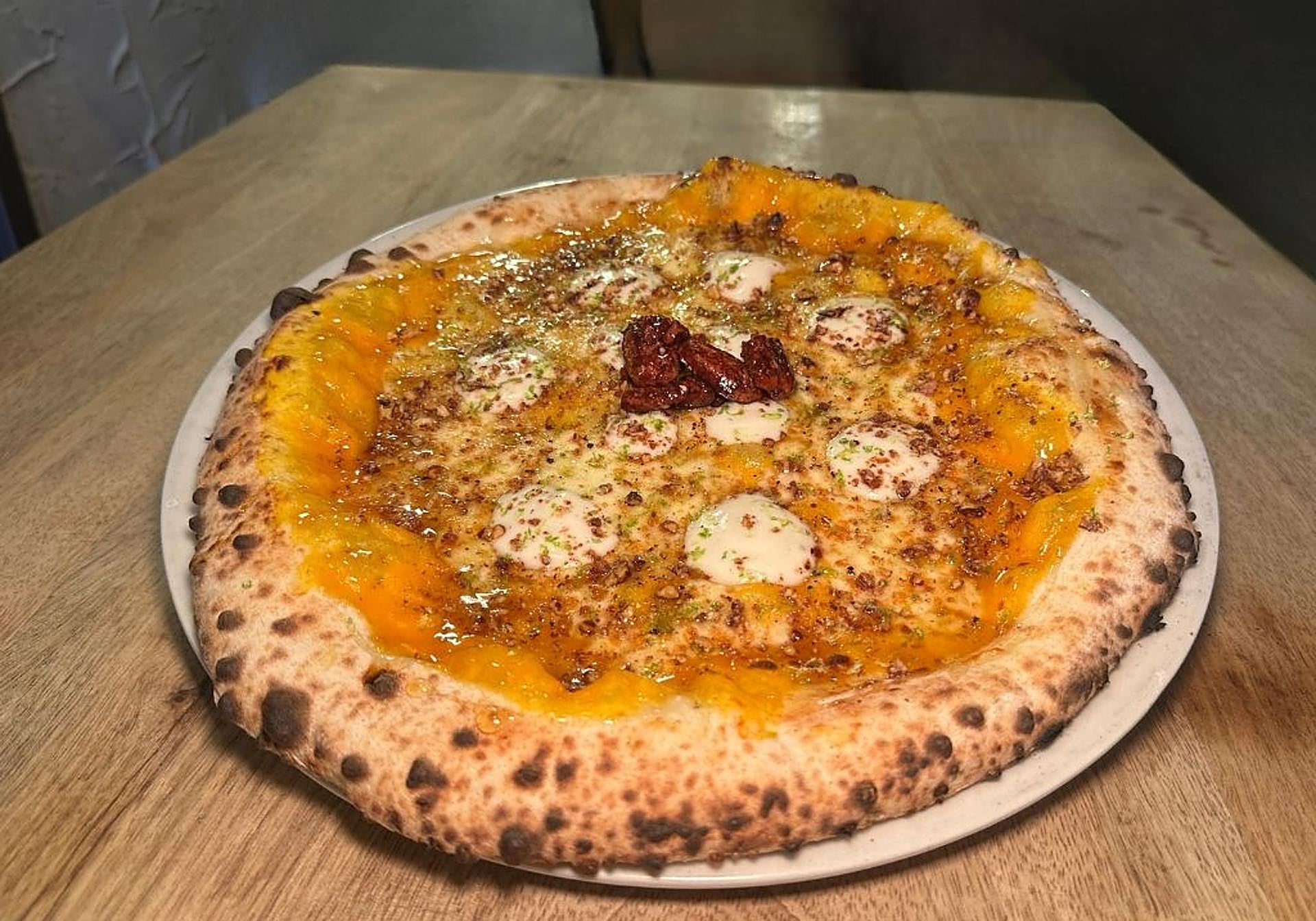 Vamos con la provincia que cuenta con mayor numero de pizzerías participantes. El Five Napoli Pizza Salamanca se encuentra en la capital, cadena que también cuenta con un local en Valladolid. La Vavá es su propuesta para este año, y lleva una base de crema de Zucca confitada en horno de leña con esencia de chile, mozzarella fior di latte, pimienta negra molida, perlas de gorgonzola texturizada, miel, parmigiano reggiano 24 meses DOP, ralladura de lima y lluvia de nueces garrapiñadas.