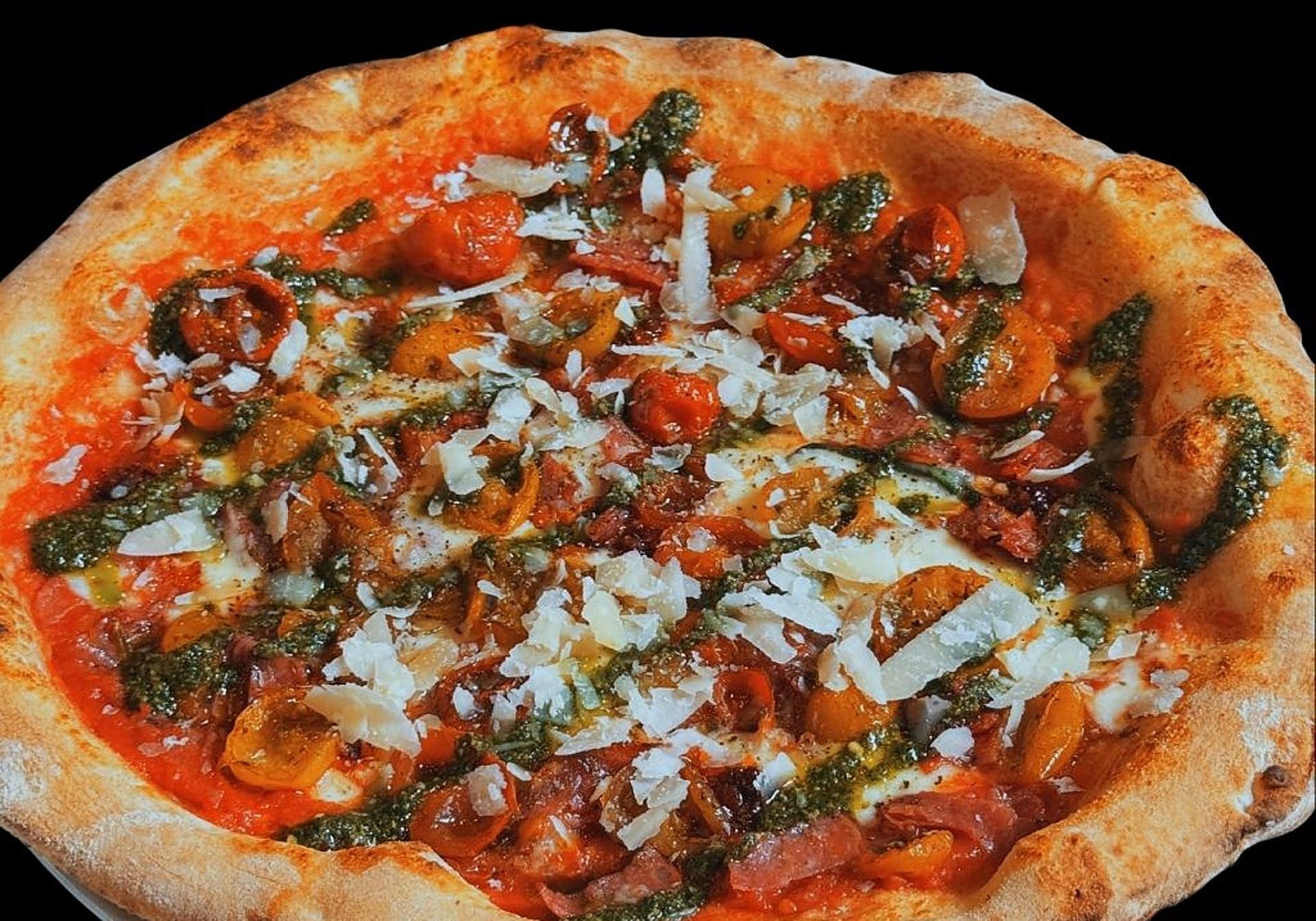 Está hecha con tomate y mozzarella de búfala y al final de su elaboración, se añaden virutas de grana y una salsa de pesto rojo.