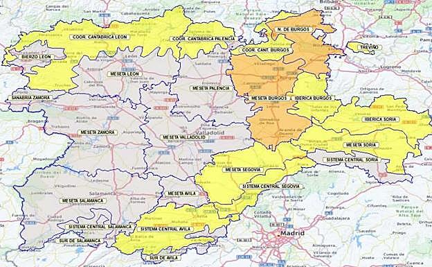 Una vez activada la Fase de preemergencia, las zonas de meseta y el norte de Burgos pasa a alerta naranja mientras que toda la provincia de Segovia y la zona del Sistema Central de Ávila pasarán a amarilla. En esa fase se encuentra también casi toda la provincia de Soria y la parte de la Cordillera Cantábrica de León, Palencia y Burgos así como la ibérica de esta última provincia.