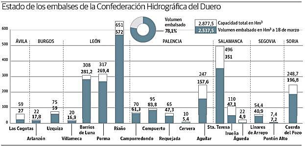 De momento, los datos son contundentes y, mientras que el conjunto de los embalses están al 78% de su capacidad, Las Cogotas tan solo almacena el 45,7%; Cervera el 56,6% y Aguilar al 64,1%. A juicio del presidente de la comunidad de regantes Río Adaja, Juan José Rodríguez, «está asegurado el riego de una cuarta parte de la superficie que tenemos».