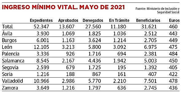 De los 52.347 expedientes validados por la Seguridad Social hasta mayo en Castilla y León, 13.607 fueron aprobados, mientras que los denegados fueron el doble: 27.560. Otras 11.180 solicitudes siguen en trámite y hay algunas más en fase de subsanación. La mayor parte de los casos rechazados lo son por superar los límites de patrimonio y unos ingresos inferiores a la renta que garantiza el IMV, que son 470 euros al mes para adultos que vivan solos. Esta cantidad se va incrementando por cada conviviente adicional, hasta un máximo de 1.033 euros.