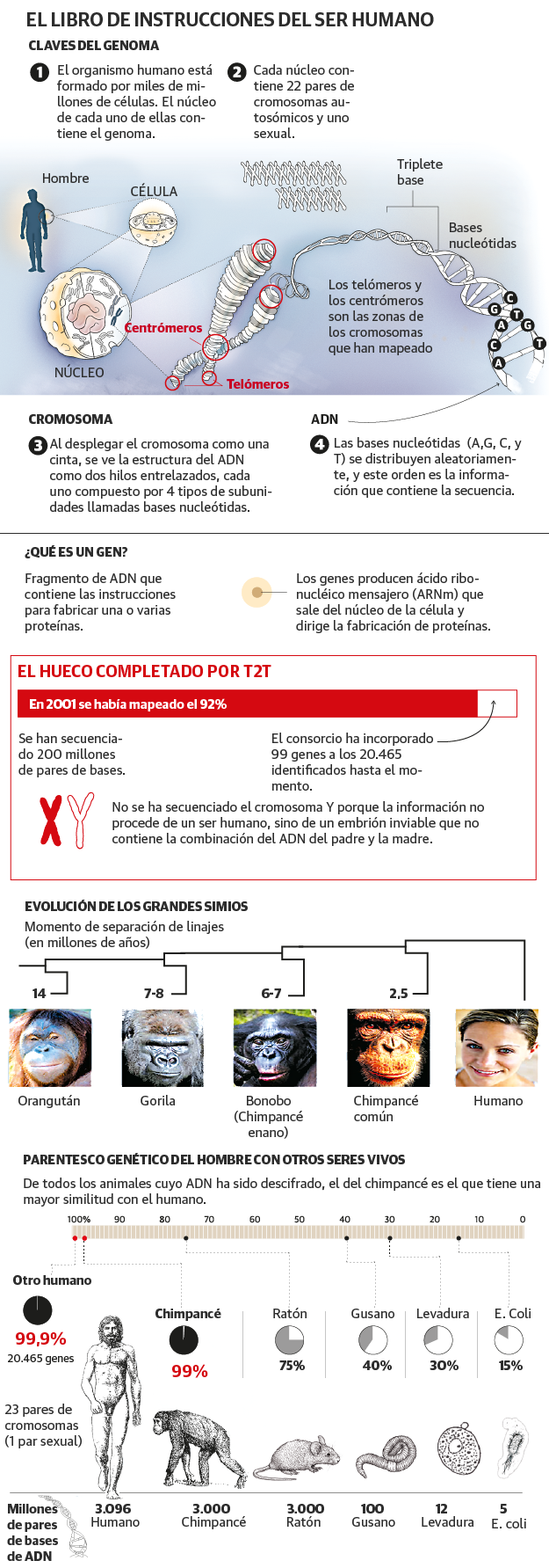 El libro de instrucciones de una persona, su genoma, contiene 3.096 millones de pares de bases, de letras químicas. Ahí está todo, desde el color del pelo hasta la propensión a sufrir enfermedades, en una larga secuencia de ADN repartida en 23 pares de cromosomas en el núcleo de cada célula, exceptuadas las sexuales. Hace veintiún años, el primer borrador del genoma humano abarcaba el 92%. Hoy, el Consorcio Telómero a Telómero (T2T), un grupo internacional de científicos liderado por los Institutos Nacionales de la Salud de Estados Unidos, presenta en la revista 'Science' el 8% restante, que hasta ahora no se podía leer y permitirá ahondar en el origen de enfermedades.