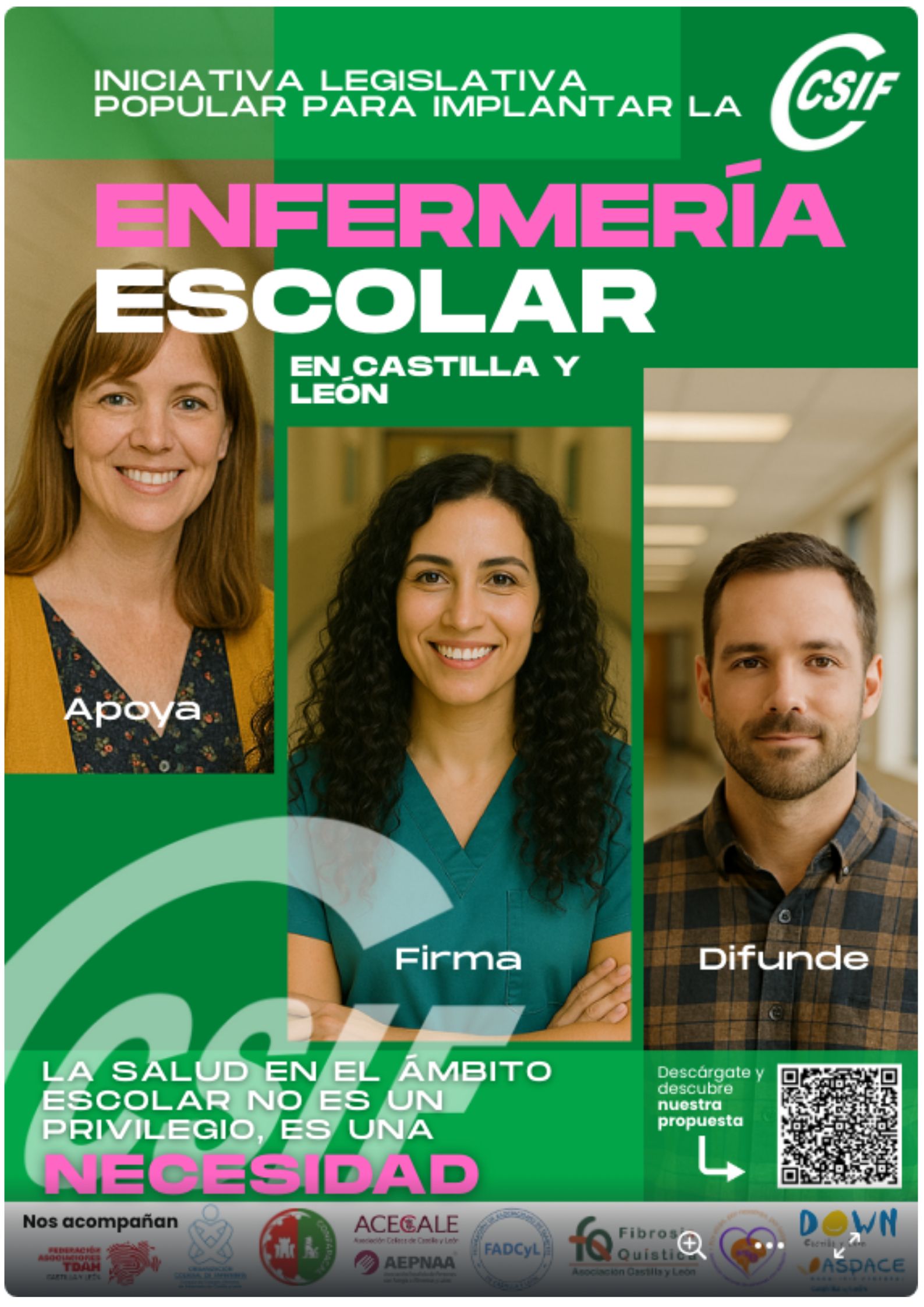 La Central Sindical Independiente y de Funcionarios (CSIF), con la presencia de los responsables del Consejo de Enfermería y las AMPAs (Confapacal) de Castilla y León, y el apoyo de otras muchas entidades asociativas de diversas enfermedades de la Comunidad –TDAH, celiaquía, diabetes, alergias, fibrosis quística, epilepsia…– han lanzado una campaña de recogida de firmas para impulsar la aprobación de una Ley de Enfermería Escolar en las Cortes autonómicas. El objetivo es garantizar que todos los centros educativos de Castilla y León cuenten con un enfermero o enfermera escolar, «una demanda de la comunidad educativa –docentes y familias– y de la sociedad, y una necesidad sanitaria que hay que cubrir».