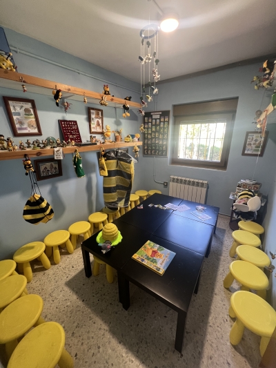 Hay una estancia, especialmente adaptada para el uso infantil, con mesas y taburetes que facilitan la realización de actividades y juegos que tratan de acercar a los más jóvenes al mundo de las abejas.