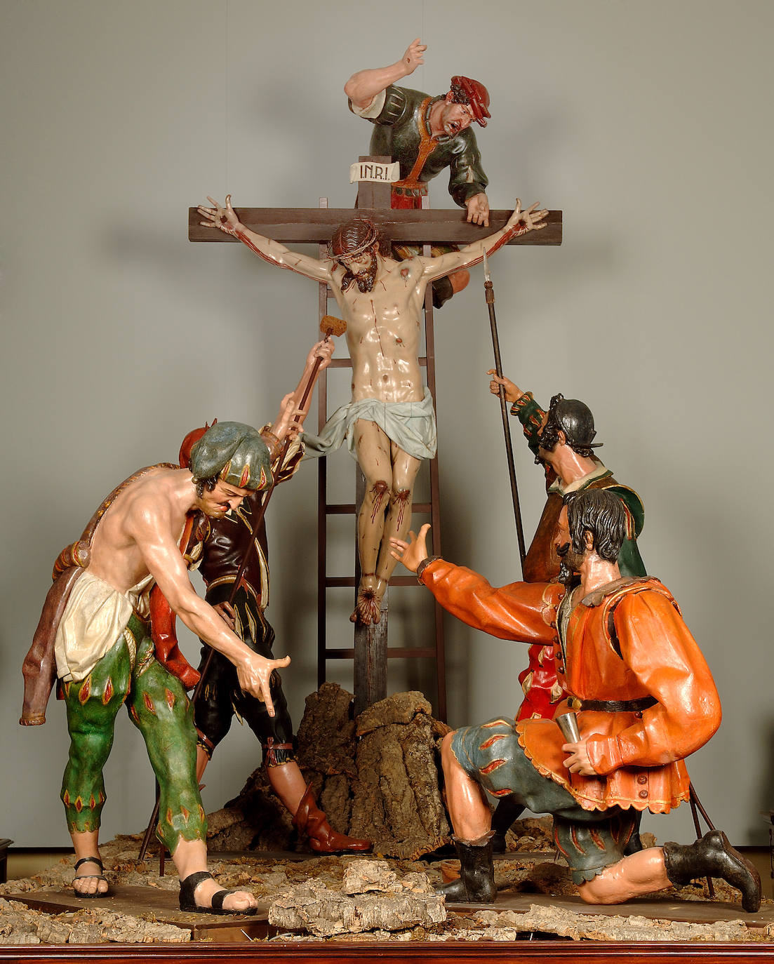 La escena refleja el instante posterior a la elevación, con un Cristo de blanda anatomía aún vivo, acompañado de cinco sayones que ejecutan distintas acciones recogidas en los Evangelios.