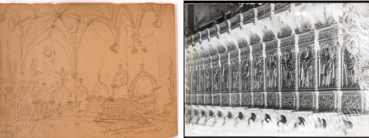 Los dibujos de la colección, por la delicada y sensibilidad a la luz, apenas se muestran. Los bocetos de Genaro Pérez Villaamil son memoria decimonónica de las vistas, monumentos y de los tipos humanos de diversas ciudades como Valladolid, Salamanca, Ávila, Guadalajara y Toledo; con múltiples anotaciones compositivas y reflexiones del artista: ‘encarnación’, ‘Luz / Sombra / obscuro / ladrillos’, ‘Ricos adornos / Siglo 16’,… Igual de delicadas y frágiles son las placas de vidrio del Archivo fotográfico de Ubaldo Torquemada, adquirido en 2018.