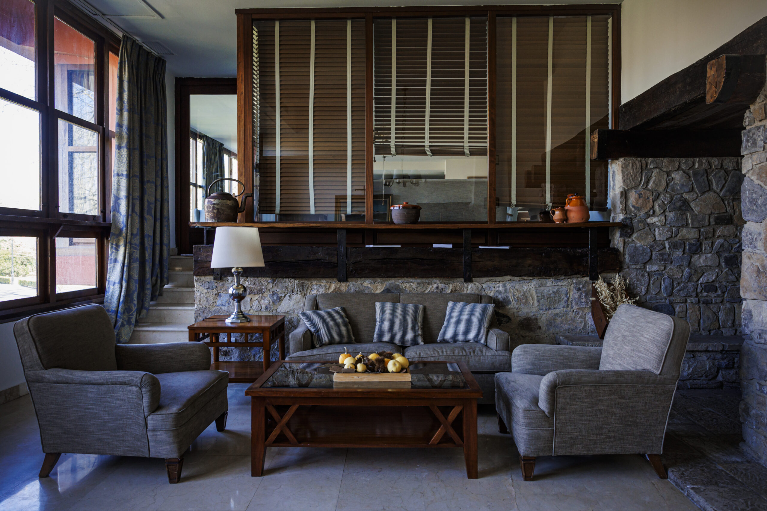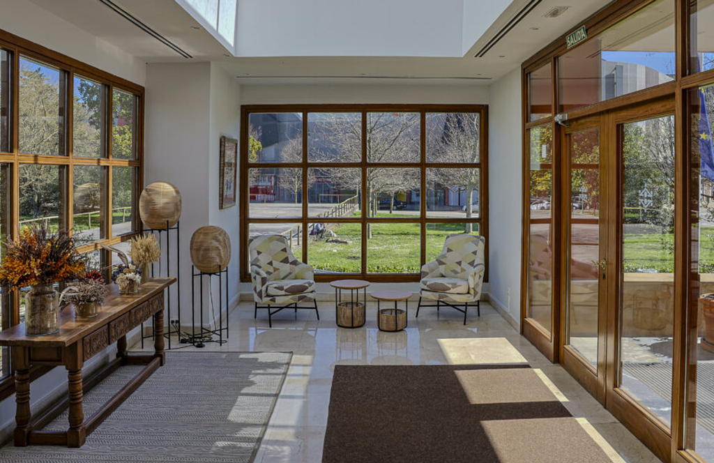 El interior es, como dice la directora, “muy sencillín”. Es lo que nos gusta, nos atrae. Una casita (por utilizar ese diminutivo tan asturiano) íntima, de 40 habitaciones exteriores, la galería-cafetería, terraza, un amplio y hermoso comedor (qué fabada…), y un confortable y delicado matrimonio entre elementos rústicos (esas techumbres atravesadas por vigas de madera) y destellos de mobiliario contemporáneo, como esos butacones del lobby. Amplias cristaleras que inundan de luz todo el Parador, que engrandecen un ‘saloncito’ pequeño con chimenea y el Salón Parque, afables, cálidos, que surgen sin fronteras con los lugares de paso, estupendos para sentarse y gozar de una buen libro, una conversación o la simple y relajada contemplación.