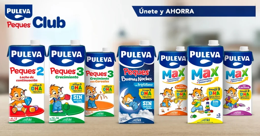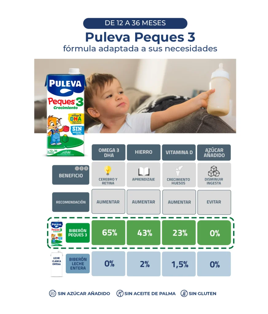 Puleva Peques 3 (a partir de los 12 meses): Dirigida a niños a partir de los 12 meses, Puleva Peques 3 está enriquecida con Omega 3 DHA, hierro, calcio y 13 vitaminas esenciales. Esta fórmula ayuda al correcto desarrollo físico e intelectual del niño y no contiene azúcar añadido en su versión más consumida.