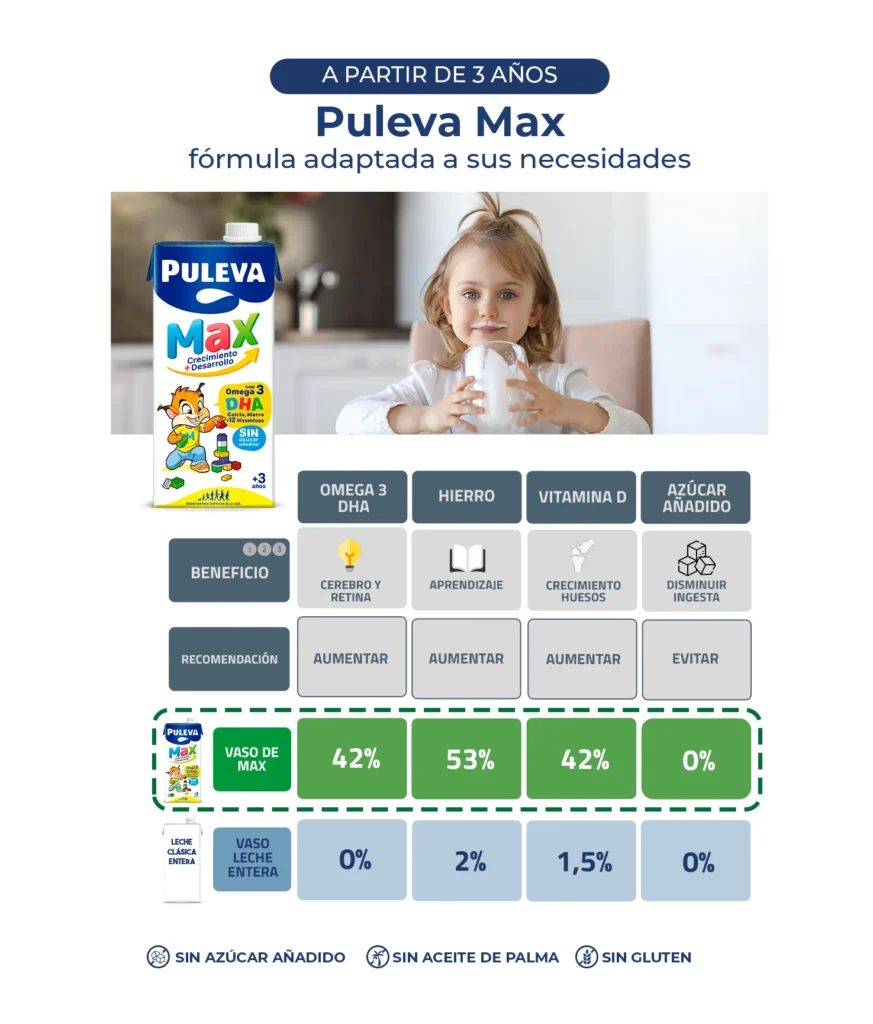 Puleva Max (a partir de los 36 meses): Formulada para niños a partir de los 36 meses, Puleva Max está enriquecida con Omega 3 DHA, hierro, calcio, 13 vitaminas y minerales como fósforo, magnesio y zinc. Esta leche de crecimiento favorece el desarrollo saludable de los niños y proporciona 24 veces más hierro que la leche de vaca.