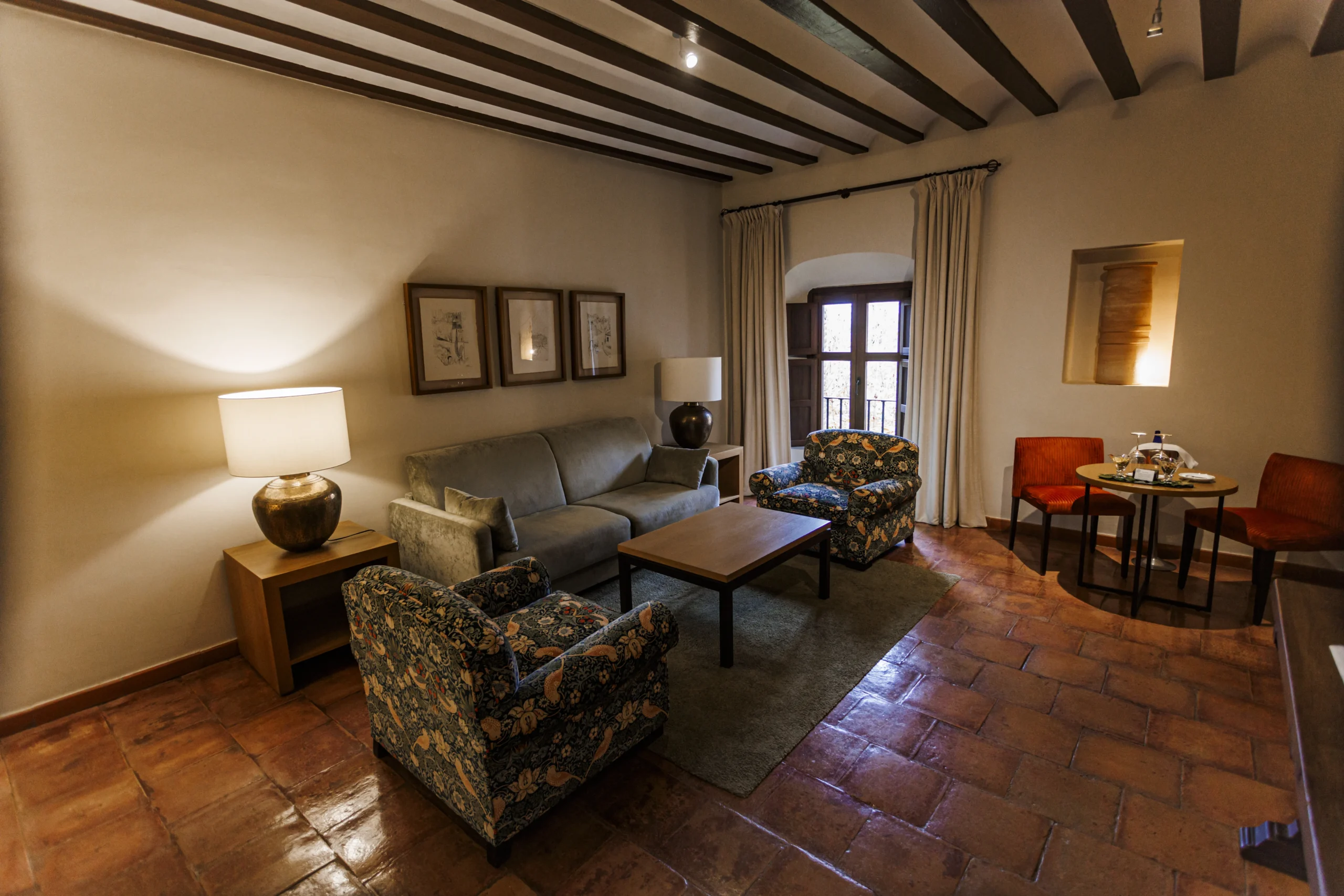Merece la pena destacar otras de sus más gratas sorpresas: la capilla real, llamada ‘Habitación Capilla Felipe V’, con un baño lujoso y un papel pintado a mano que representan los jardines de Aranjuez. Ocupa el espacio de la antigua sala de oración y se considera —sin ningún género de dudas— como la más romántica del Parador. Su original dosel y la arboleda le otorgan ese carácter de sueño en el que cualquiera desearía vivir. En ella han descansado actores como Margot Robbie o Matt Dillon. Esta estancia acapara miradas y sueños de boda y cine. La otra es la ‘Habitación de la Condesa’. Esta fue el cuartel general de Wes Anderson (la única con una terraza espectacular) y con el tamaño para poder trabajar y descansar. Es una estancia que transmite serenidad y en la que cobran protagonismo los textiles. Destaca el famoso estampado Ladrón de Fresas, del diseñador William Morris. Tal es la belleza de esta estancia que en ella también se hospedaron artistas como Mark Knopfler o Tina Turner.