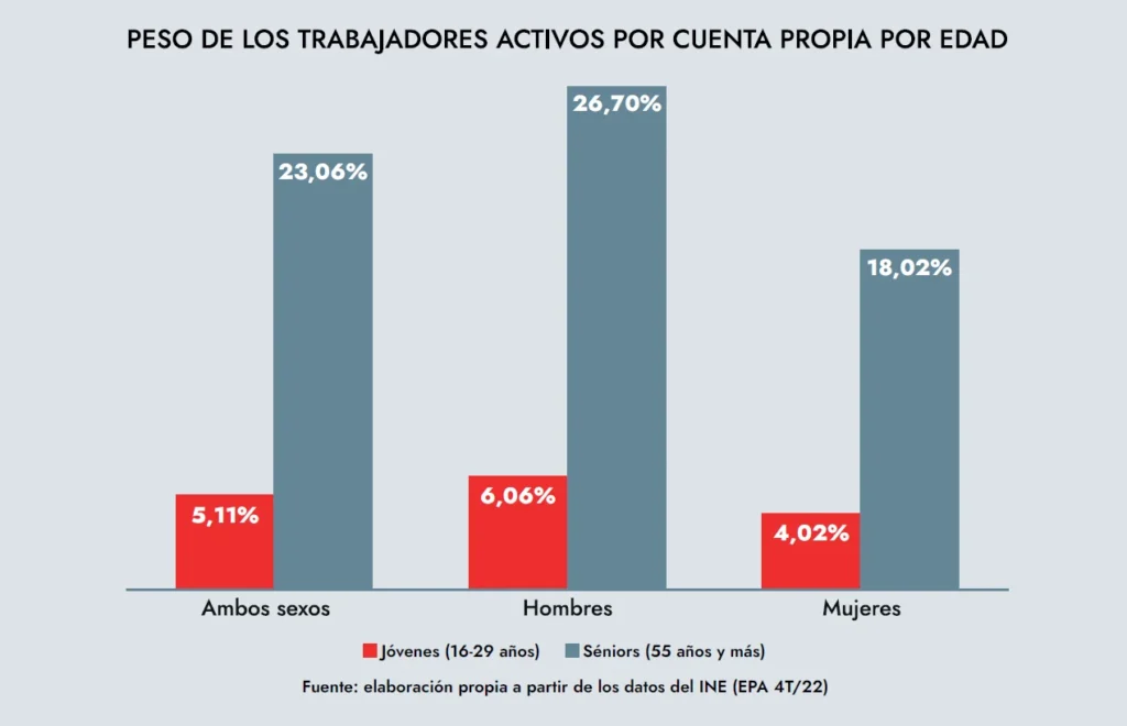 En líneas generales, ellas trabajan menos por cuenta propia y más en las actividades a tiempo parcial y en el sector público. De hecho, hay casi el doble de hombres sénior que de mujeres dados de alta como autónomos. Solamente un 38% de los sénior autónomos son mujeres.