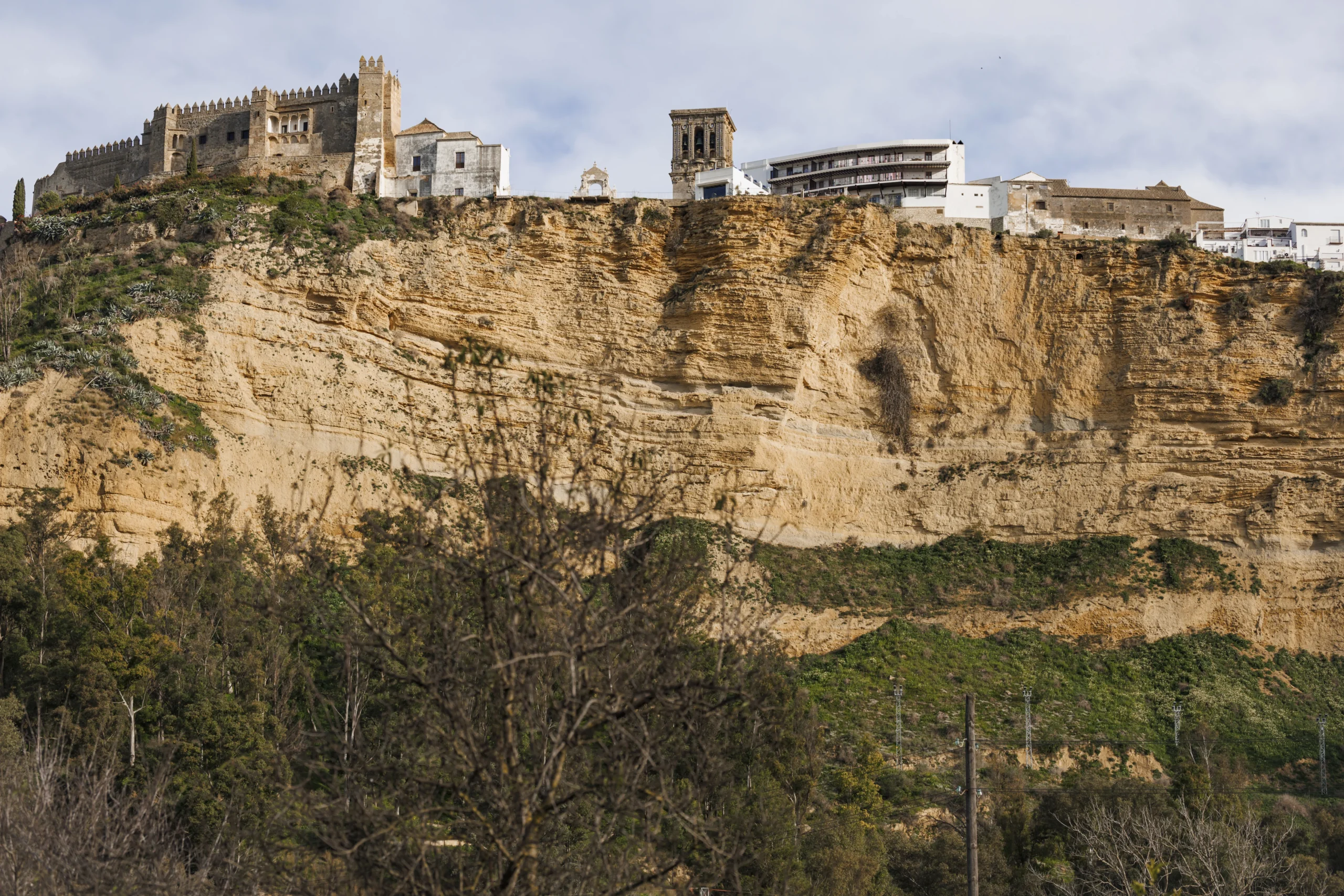 “La puerta a los pueblos blancos de Cádiz” es como lo define el director de su Parador, Francisco Jesús de Manuel. Este beculense, tras casi once años al frente del Parador, ha plantado su corazón en Arcos. Aquí, en la peña que corona el río Guadalete, se contempla el verdor atlántico de su naturaleza que contrasta con las blancas casas. La plaza donde se ubica es pequeña, menuda, con vistas a la campiña y a la historia. “De un lado, en la plaza, la Basílica Menor de Santa María de la Asunción, el castillo de los Duques de Arcos; al otro, los campos que se pierden en el horizonte”, cuenta. La basílica se levanta sobre una mezquita, es de origen mudéjar y data del siglo XIV, posteriormente se convirtió en una iglesia gótica, cuya influencia es la imperante en el interior. El campanario hará las delicias de los aficionados por la arquitectura con sus detalles azules. Su torre, sin embargo, no es la original, se construyó en el siglo XVIII, pues sustituía a una anterior que sucumbió a causa del trágico terremoto de Lisboa de 1755. Por su parte, el castillo ducal, aunque de propiedad privada, fue un antiguo alcázar andalusí del siglo XI. El origen musulmán del edificio se mezcla con las reformas de los siglos XIV y XV; de la primera época conserva el gran arco de herradura de la entrada y una parta de su muralla.