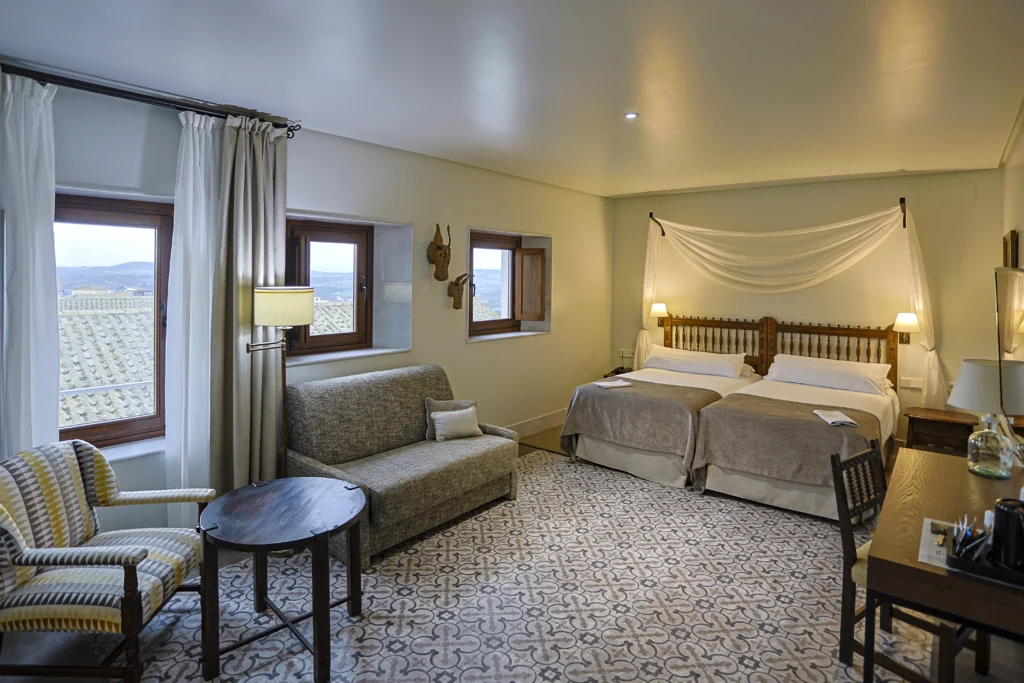 El mejor nexo entre ambas esferas, es la terraza del Parador, para dominarlo todo, para deleitarse con esas vistas henchidas de calma. Este mirador es como una promesa, alberga lo mejor del paso del tiempo, los mejores amaneceres, el sol durante el día y las líneas violáceas de un crepúsculo que se mezcla con los campos sin límites. El hecho de disfrutar de un café mientras uno goza del noble arte del dolce far niente es una experiencia trascendente. Erigido en 1966, su arquitecto, José Luis Picardo, proyectó un edificio sencillo que respetara el estilo del lugar; de hecho, su fachada es de estilo neoclásico, pero lo más llamativo es su interior: con un marcado espíritu neomudéjar que nos lleva directamente al patio andaluz con enrejados y azulejos que representan la obra de “El Corregidor y la molinera”, una carpintería fina con arabescos y pasillos plácidos de luz tenue anaranjada. La atmósfera que envuelve al edificio es el de las típicas casas andaluzas, con su zaguán. El nombre oficioso del Parador, además, es el de “El Corregidor”, por la leyenda que atraviesa Arcos.