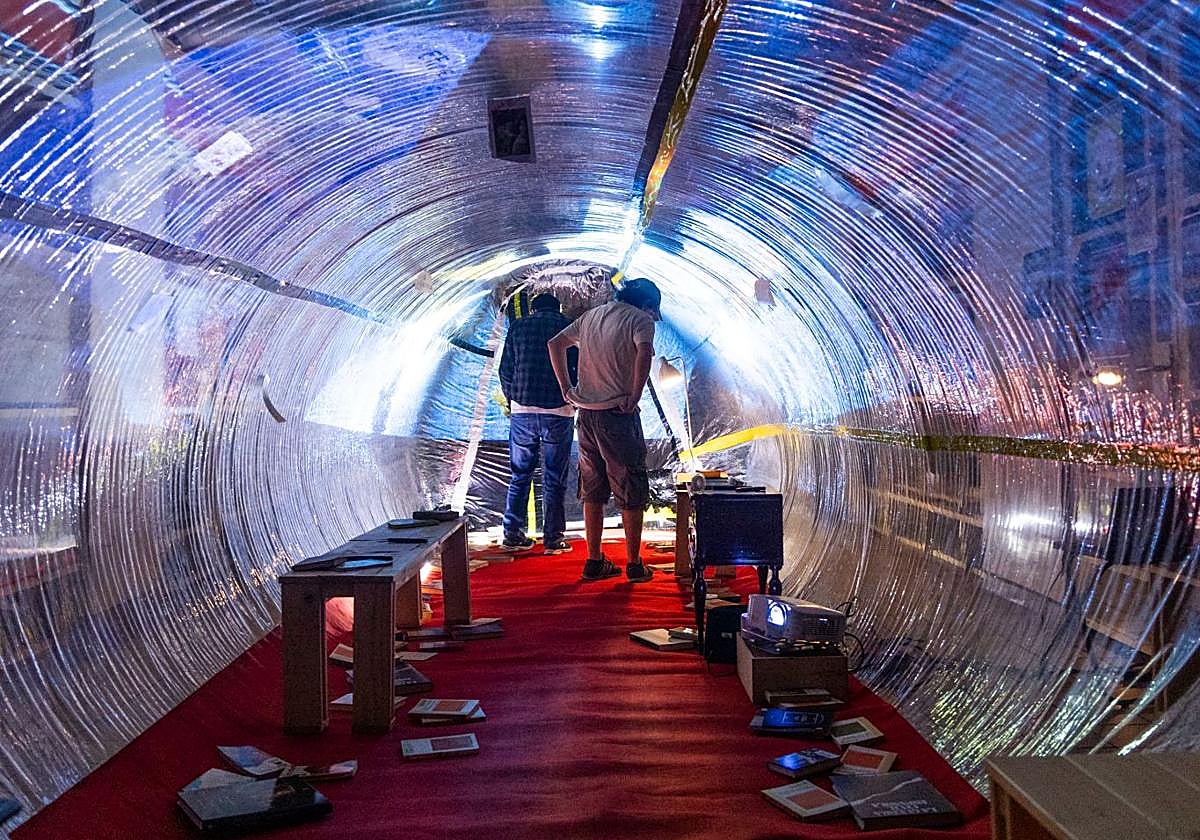 Pero no solo de pinturas se compone esta edición de Ephemera Phestival. Con 'Hinchable', Toño Macías «Ratpilot» ha querido rendir tributo al innovador representante de la arquitectura efímera en Valladolid; José Miguel de Prada Poole, fallecido hace apenas cuatro años. «Es una cúpula de plástico donde se puede pintar en las paredes, leer libros, dejar mensajes o simplemente dejarse llevar por la ambientación, con la proyección de fauna marina y el gramófono que evoca el mar», explica el artista.