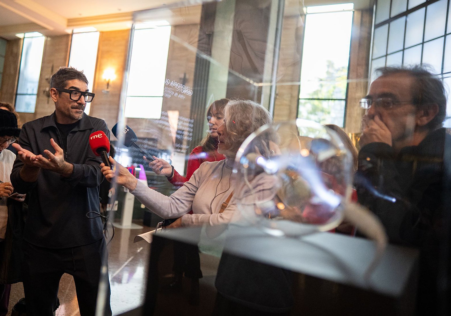 Solimán López ante la burbuja que almacena la copia del 'Quijote 2.0' en una molécula de ADN. EFE