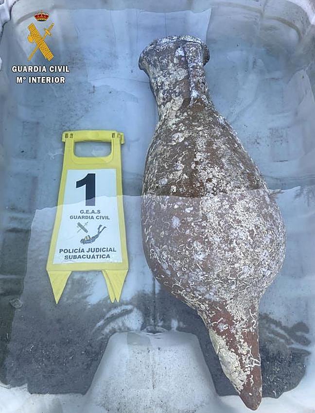 Según ha explicado la Comandancia local de la Benemérita en un comunicado, los guardias encontraron la pieza «semienterrada entre escombros y fango» y sin tapón, por lo que estaba «colonizada por diferentes organismos marinos» y llena de «conchas y piedras».