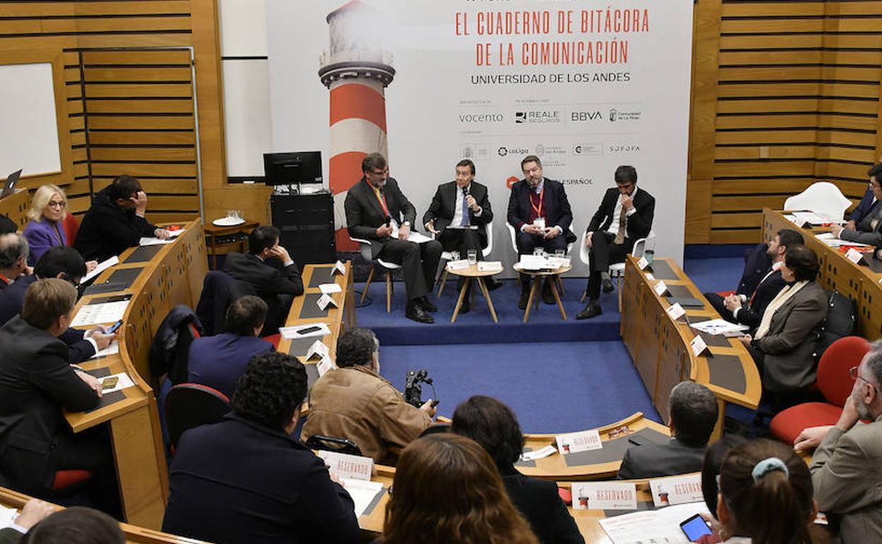 La época dorada de la información ha dado paso a la era de la desinformación. Una paradoja a la que las redes sociales han abierto las puertas de par en par. En este contexto el diagnóstico es que la sociedad sufre una sobreinformación «que está llena de colesterol y de ácido úrico, de enfermedades metabólicas». Con este símil el director de ABC, Bieito Rubido, ha expuesto su visión sobre el papel del periodismo en la era de la desinformación, en uno de los tres debates programados dentro de la segunda jornada del IV Foro Futuro en Español que ha tenido como escenario la Universidad de los Andes, colaboradora, junto a LaLiga y la embajada española en Chile, en la iniciativa de Vocento, que cuenta con el patrocinio de Reale Seguros, BBVA y el Gobierno de La Rioja.