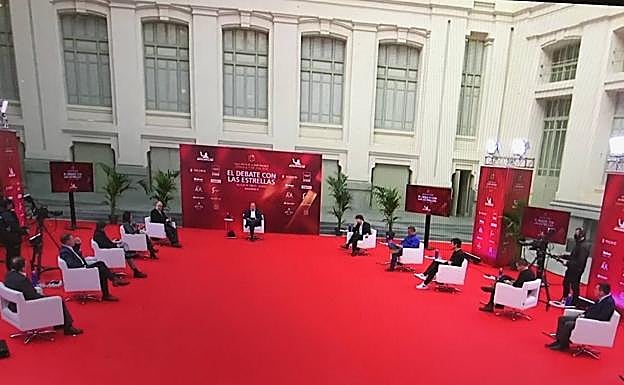 Michelin auspiciaba la reunión, que presentaba la actriz Cayetana Guillén Cuervo y moderaba el presidente de la división de Gastronomía de Vocento, Benjamín Lana. Sentados en «v», los once triestrellados de la península ibérica, todos españoles -Portugal no cuenta con ningún restaurante en esta categoría-. Eran Joan Roca (El Celler de Can Roca, Girona), Martín Berasategui (Martín Berasategui, Lasarte), Pedro Subijana (Akelarre, San Sebastián), Elena Arzak (Arzak, San Sebastián), Eneko Atxa (Azurmendi, Larrabetzu), Jordi Cruz (ABaC, Barcelona), Quique Dacosta (Quique Dacosta, Dénia), Ángel León (Aponiente, El Puerto de Santa María), Paolo Casagrande (Lasarte, Barcelona), Jesús Sánchez (Cenador de Amós, Villaverde de Pontones) y David Muñoz (Diverxo, Madrid).