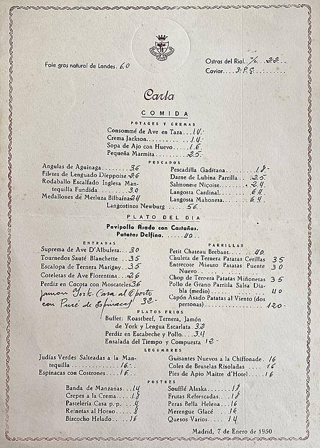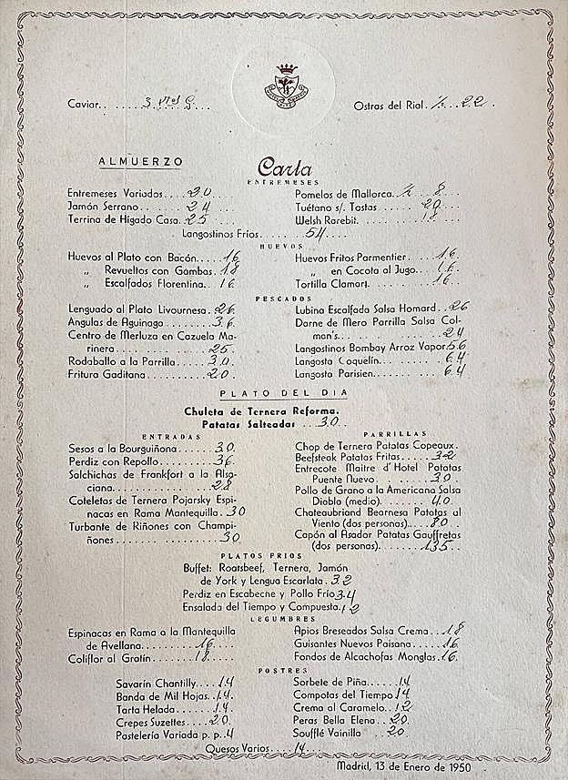 El sábado 7 de enero de 1950, por ejemplo, el plato del día (la opción más completa y sencilla de la carta) costaba nada menos que 40 pesetas, mientras que un viernes costaba únicamente 30. El caviar se cobraba por gramo, a 3 pesetas cada uno, y las ostras por medias docenas a un precio de 22. Productos que ahora consideramos de absoluto lujo, como las angulas, aparecen en la carta a 36 pesetas mientras que ingredientes actualmente mucho más asequibles, como el foie gras, subía a nada menos que 60. Lo más barato del menú eran las ensaladas y las cremas (14 pesetas por un consomé de ave, una castiza sopa de ajo con huevo o una ensalada del tiempo), mientras que lo más caro era –aparte del foie– la langosta y el capón asado con patatas infladas, que para dos personas marcaba un importa de 135 peseta-zas. Lenguado Deippoise, rodaballo a la inglesa, salmonete à la Nicçoise o escalope Marigny alternaban con recetas nacionales como los medallones de merluza a la bilbaína, fritura gadi-tana, perdiz con moscatel o jamón serrano.