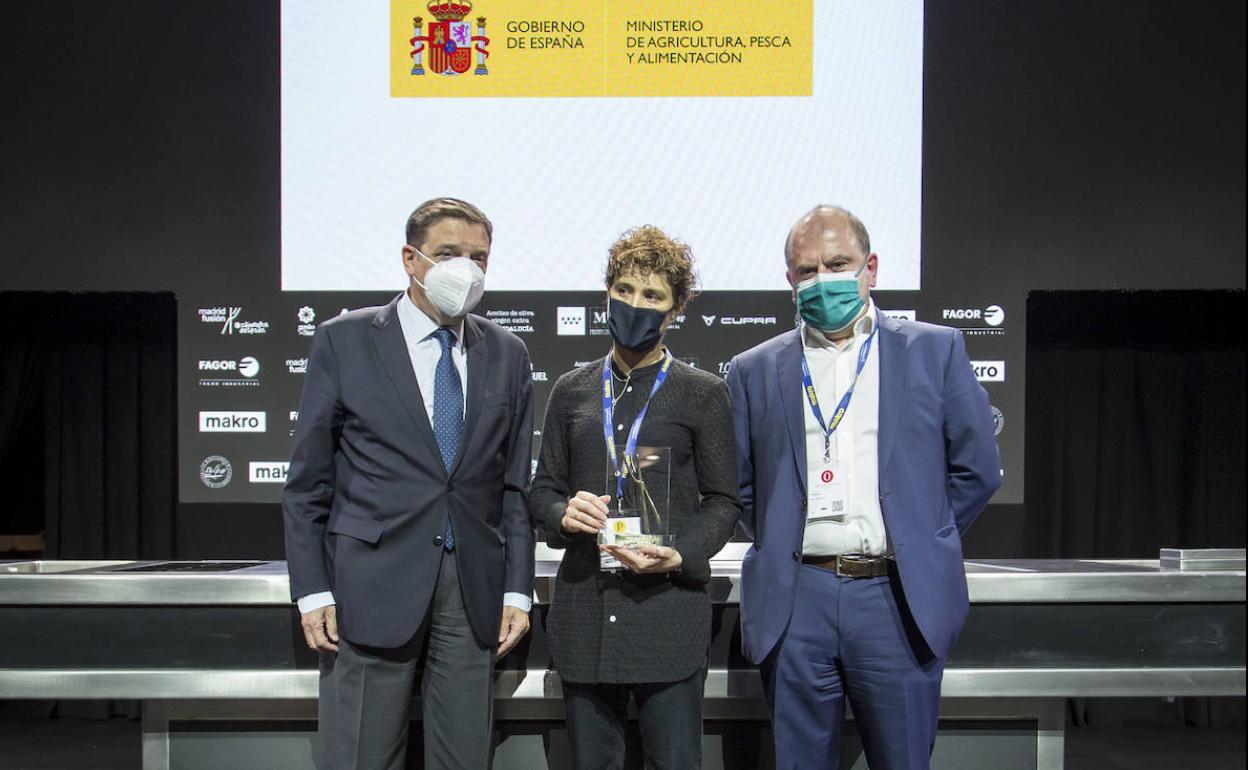 La cocinera gana el nuevo galardón de Madrid Fusión, entregado por el ministro de Agricultura, Luis Planas, por la «defensa de los productos españoles» fuera de las fronteras