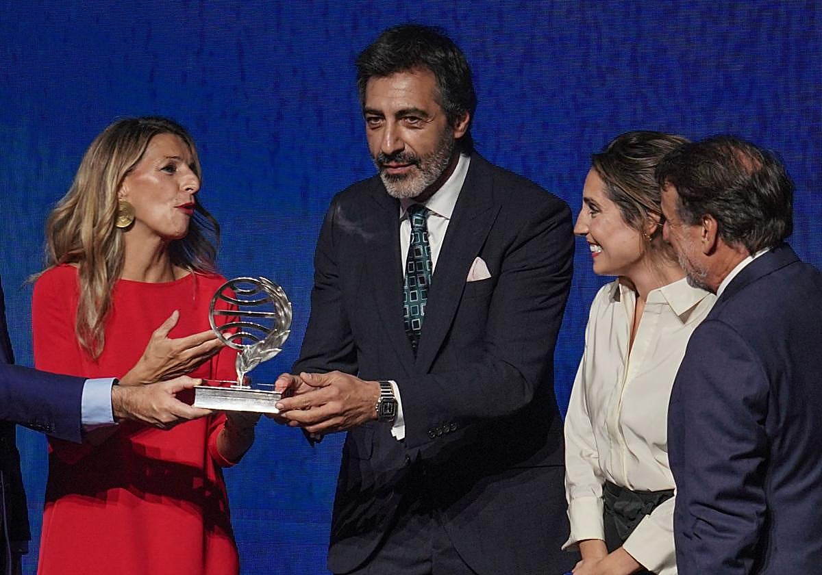 Juan del Val, este miércoles por la noche en Barcelona recibiendo el Premio Planeta de novela de manos de la vicepresidenta segunda, Yolanda Díaz. AFP