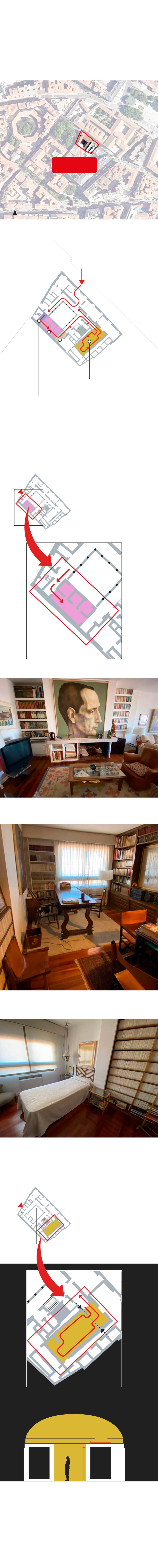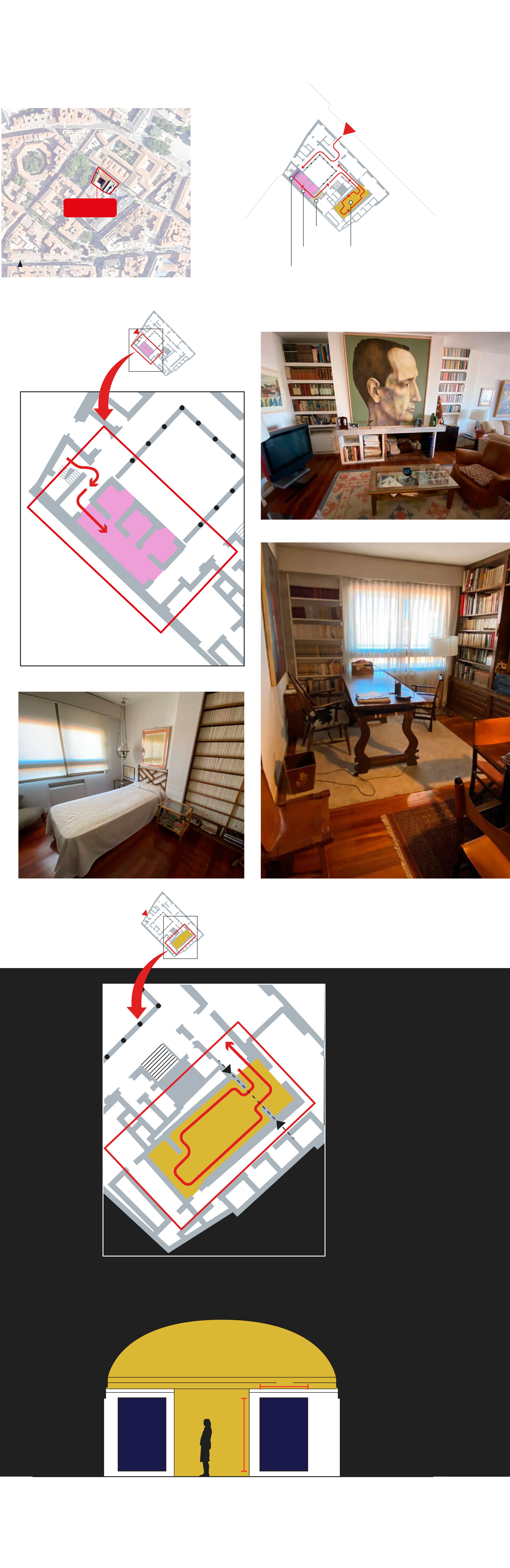 La entrada en la casa se encuentra en la calle San Diego en el edificio renacentista que guarda el Archivo General de Castilla y León. Desde ahí se pasa al patio que distribuye el espacio a las dos estancias que ocupa el museo en la planta baja. La primera, dedicada a la recreación de su casa: el salón, el despacho y el dormitorio. La segunda, la sala de la exposición permanente. Seguido del salón, el despacho. Custodia su lugar de trabajo el retrato de Ángeles de Castro, la esposa de Delibes, que firma Eduardo García Benito y del que partió para su novela 'Señora de rojo sobre fondo gris'. El paisaje doméstico de Delibes se completa con la recreación de su dormitorio. Una pequeña cama de bambú y dos mesillas.