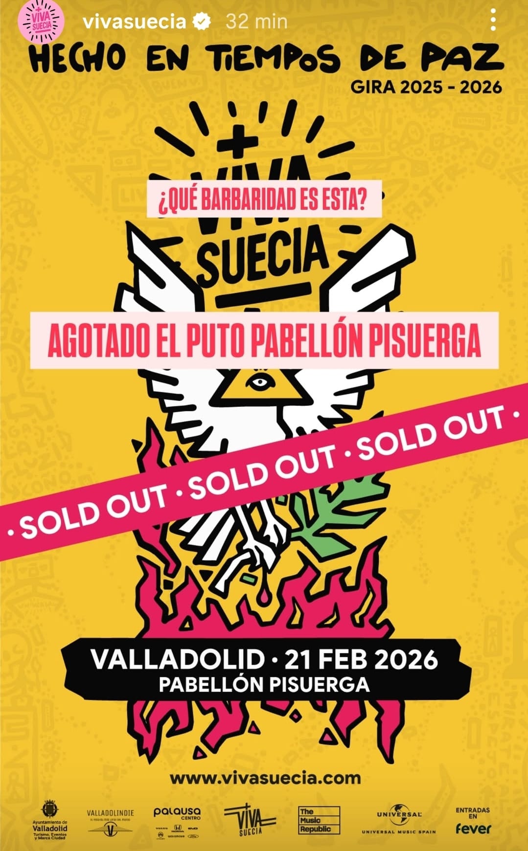 Tan solo cuatro horas han tardado en agotarse las entradas para el concierto del grupo español Viva Suecia en Valladolid. Este miércoles 17 a las 13:00 horas dentro de la plataforma Fever y también una hora antes para los usuarios registrados los fans del grupo indie podían comprar su ticket para disfrutar del que será uno de los conciertos más importantes de 2026 en la capital del Pisuerga.