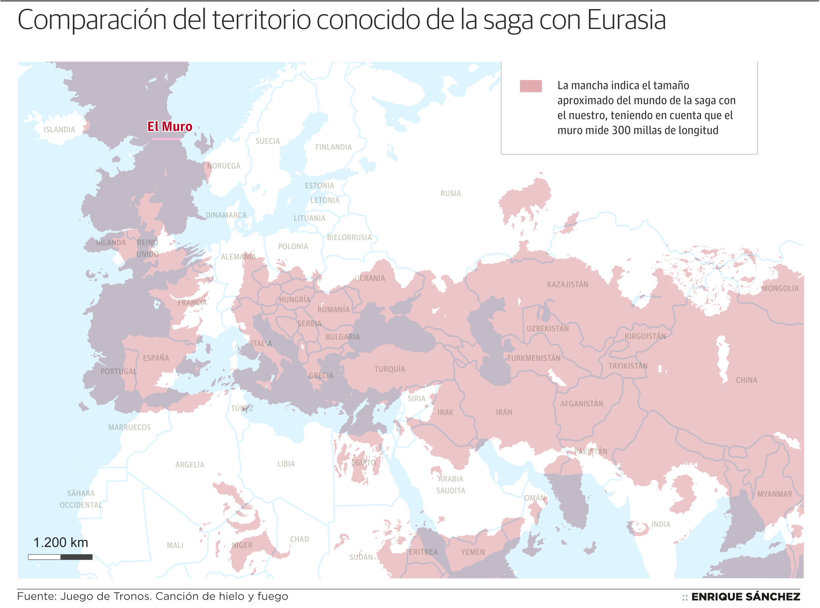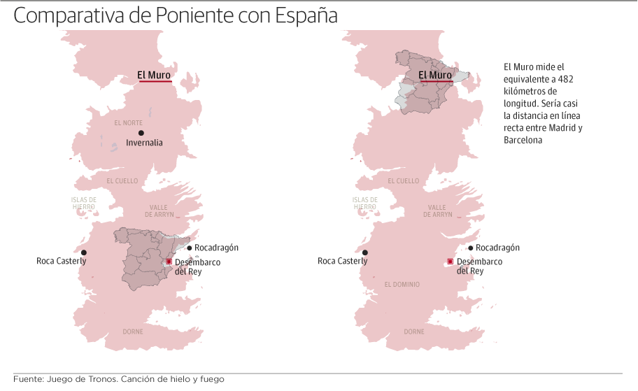 *¿Cómo hemos obtenido las dimensiones del mundo de Juego de Tronos en comparación con el mundo real? La clave, como en la serie, se encuentra en el Muro. George R. R. Martin ha afirmado en sus libros que la longitud de la muralla helada es de 300 millas. Esa medida ha servido como escala básica para representar las dimensiones del mundo imaginario. A partir de los mapas que aparecen en las ediciones de Canción de Hielo y Fuego ha resultado sencillo extrapolar los datos y aplicarlos a los mapas reales de la Tierra.