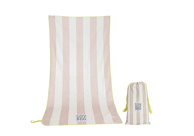 Gracias a su diseño ligero y estampado de rayas, la toalla de playa Ponette destaca en cualquier escapada veraniega. Fabricada en microfibra antiarena, mide 180x90 cm y resulta fácil de transportar gracias a su bolsa a juego. El asa amarilla y las costuras cuidadas aportan un toque moderno y funcional.