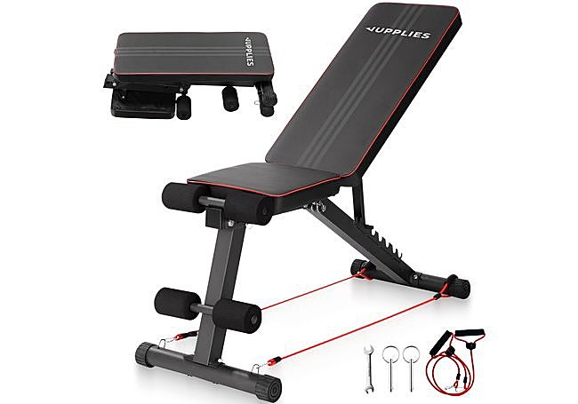Con estructura compacta y diseño plegable, el banco de musculación JUPPLIES incorpora respaldo ajustable en siete niveles y dos bandas de resistencia integradas. Su armazón de acero soporta hasta 250 kg, ofreciendo estabilidad y seguridad. El asiento ergonómico, acolchado y fácil de limpiar, junto a las bases antideslizantes, garantizan comodidad y firmeza durante cualquier rutina de entrenamiento.