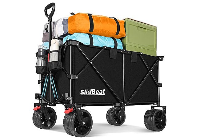 Si buscas una solución robusta para transportar lo necesario en tus días al aire libre, el carro plegable SLIDBEAT destaca por su estructura XXL y ruedas todoterreno, ideales para arena, grava o césped. El tejido impermeable 600D lo hace resistente y fiable para familias o grupos que disfrutan de largas jornadas en la playa.