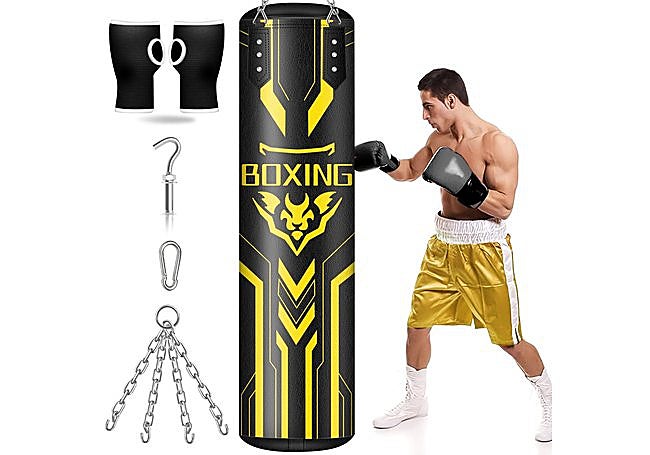 Gracias a su construcción en poliuretano de alta calidad, el saco de boxeo colgante YORWHIN para adultos resiste entrenamientos exigentes y mantiene su integridad golpe tras golpe. La superficie sintética suave y las costuras reforzadas ofrecen una experiencia de golpeo segura, mientras que la cadena de acero y el gancho permiten una instalación fiable.