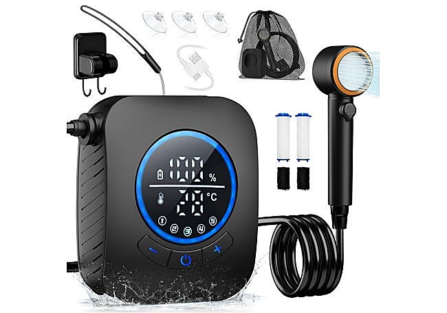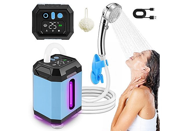 Si buscas una ducha portátil versátil para exteriores, el modelo de Rsaoty ofrece autonomía y control en cada uso. Su batería de 3000 mAh brinda hasta 90 minutos de funcionamiento, y la pantalla LED indica el nivel de batería y el modo activo. Incluye una manguera flexible, alcachofa ajustable y cubeta plegable de 20 litros para facilitar el transporte y almacenamiento.