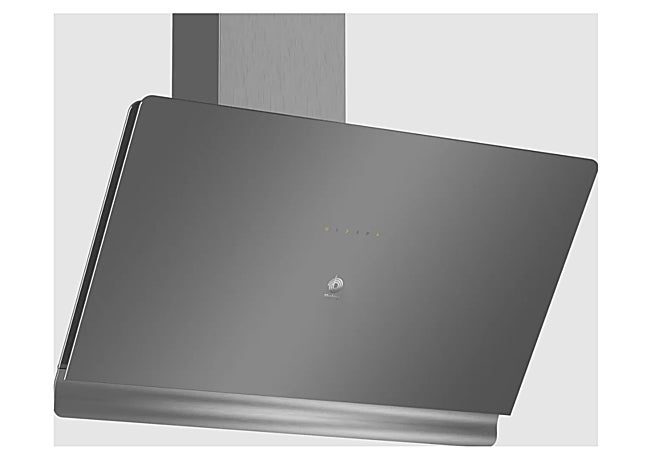 Seguimos en la Serie Cristal para hablar ahora de esta elegantísima campana de pared inclinada también en color gris antracita, por lo que se trata de una opción que deberías tener en cuenta si quieres combinar con la propuesta anterior. Tiene una anchura de 90 centímetros y cuenta con una potencia máxima de extracción de aire de 468 metros cúbicos por hora, que funciona según tu preferencia: con salida al exterior o bien con sistema de recirculación.