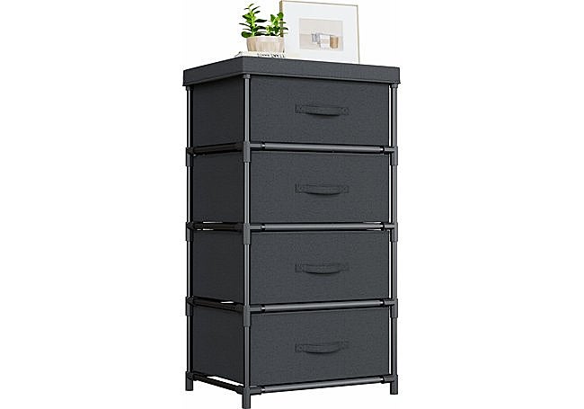 Su estructura ligera combina cuatro cajones espaciosos con un resistente marco metálico, permitiendo guardar ropa, accesorios o documentos sin perder estilo. La superficie superior es ideal para pequeños objetos o decoración, añadiendo personalidad al ambiente.