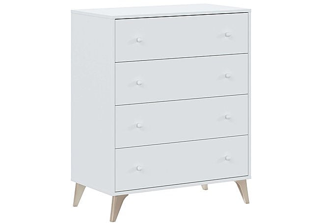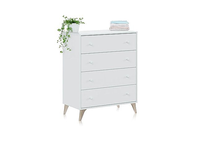 Los cuatro cajones, equipados con guías metálicas y tiradores esféricos a juego, permiten organizar ropa y accesorios de forma práctica y silenciosa. Las patas elevadas en tono madera facilitan la limpieza y añaden un matiz cálido al conjunto.