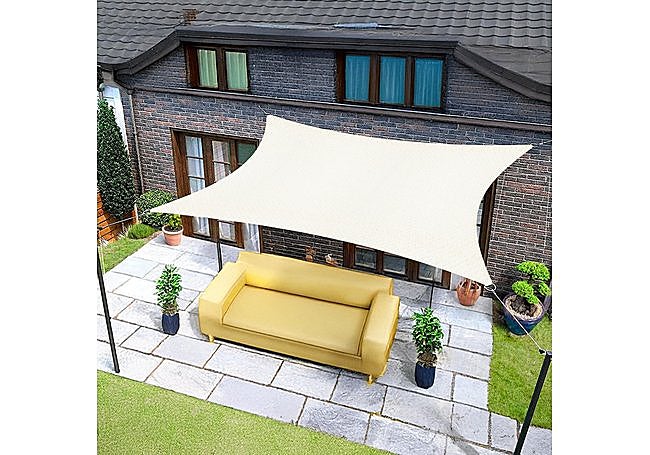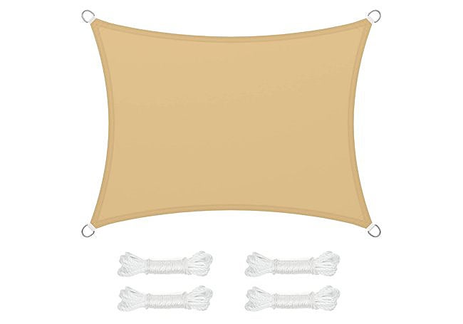 Gracias a su kit de montaje completo, instalar el toldo vela rectangular de VOUNOT es sencillo y rápido en terrazas o jardines. El tejido de HDPE de alta densidad en tono marfil bloquea hasta el 92% de los rayos UV y, al ser transpirable, permite la circulación del aire, evitando la acumulación de calor bajo la lona.