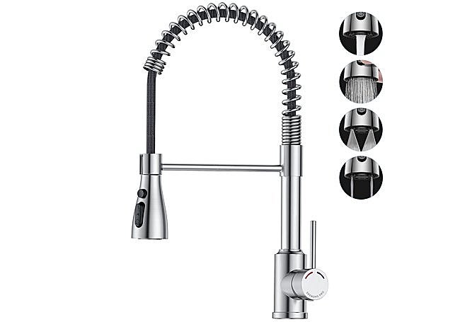 Con su diseño de arco alto y muelle expuesto, el grifo de cocina SREWOHS PRO transforma la zona del fregadero en un espacio práctico y sofisticado. El acabado en acero inoxidable aporta un brillo elegante, facilita la limpieza y resiste el desgaste diario.