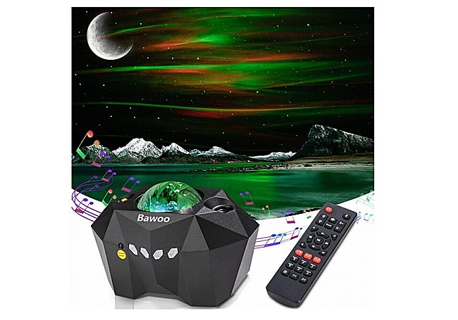 El proyector de estrellas Bawoo es un dispositivo que proyecta imágenes de auroras boreales, la luna y estrellas. Ofrece niveles de brillo ajustables, un altavoz Bluetooth y una función de temporizador que apaga el dispositivo automáticamente para ahorrar energía. El control remoto permite ajustar el brillo, la música y la dirección de proyección.